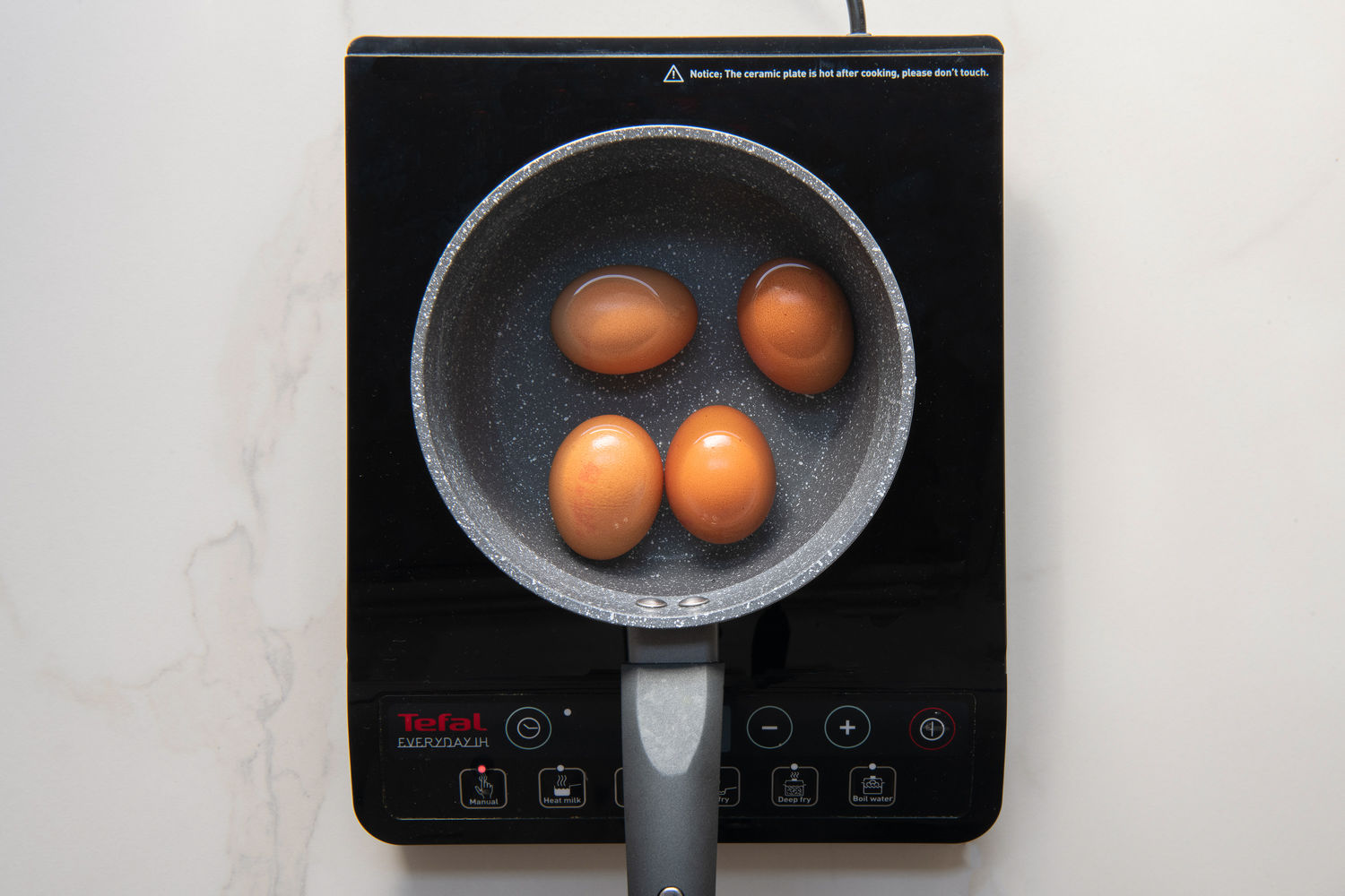 Bring a small pot of water to the boil and gently add the eggs. Boil for 7 minutes, then remove and run under cold water to halt the cooking process. Once cool, peel and slice into wedges.