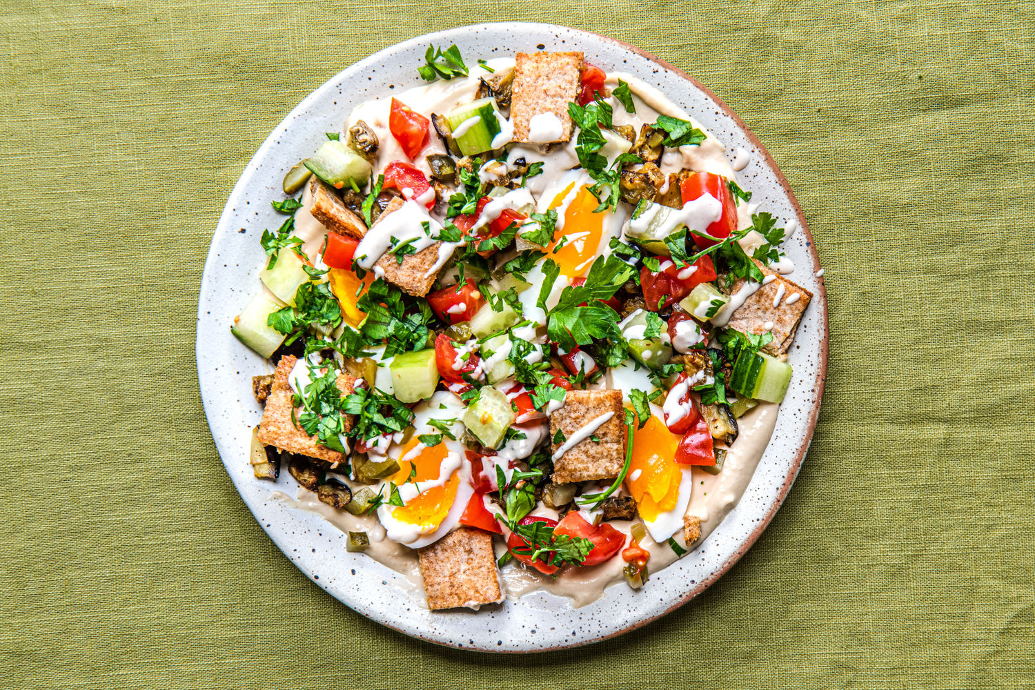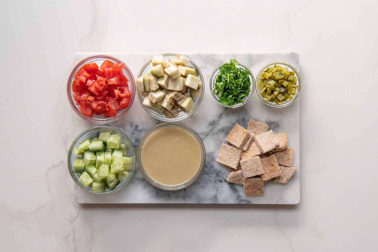 This is our salad version of a sabich, a popular street food sandwich in Tel Aviv that originated in the Iraqi Jewish community. Meltingly tender frie...d aubergine, crunchy gherkins and a refreshing chopped cucumber and tomato salad, drizzled with a luscious tahini dressing.