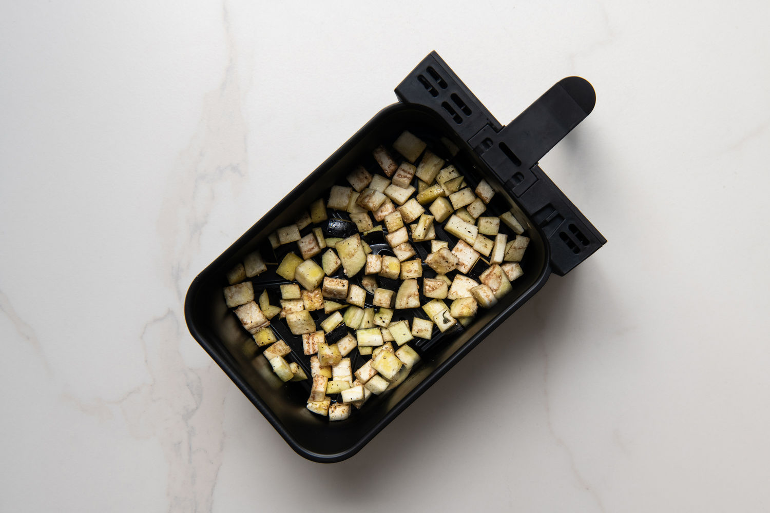 Lightly drizzle the aubergine with olive oil and sprinkle with salt and pepper. Toss to coat. Place into the basket and ‘fry’ at 190°C for 7-8 minutes, until dark golden brown and tender but not completely cooked.