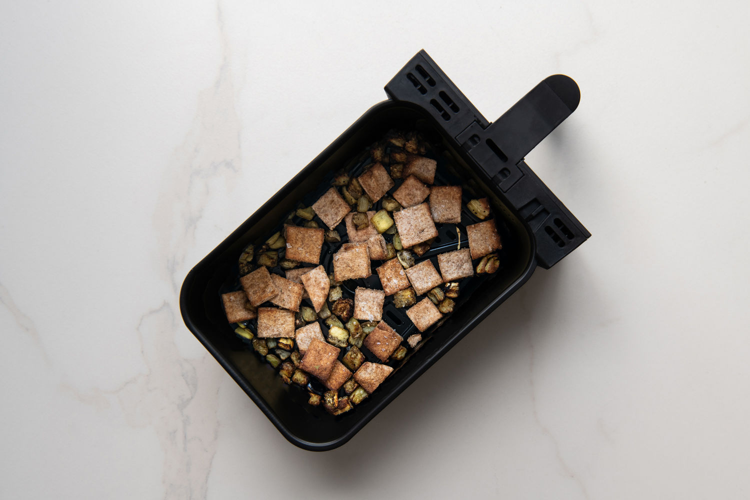 Lightly drizzle the chopped pitta breads with olive oil, sprinkle with salt and pepper and toss to coat. Add to the air-fryer with the aubergine and cook for a further 4-5 minutes, until the bread is golden and crispy and the aubergine is completely tender.