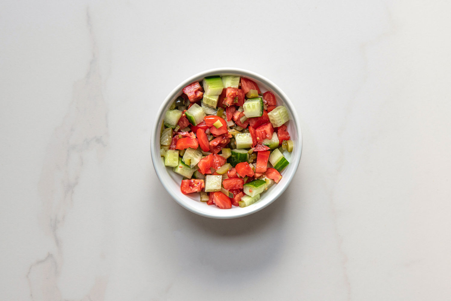 If you want to prepare in advance we recommend scraping out the seeds from the cucumber and tomatoes, which can release water over time and lead to a soggy salad. The excess pulp can be used in gazpacho.