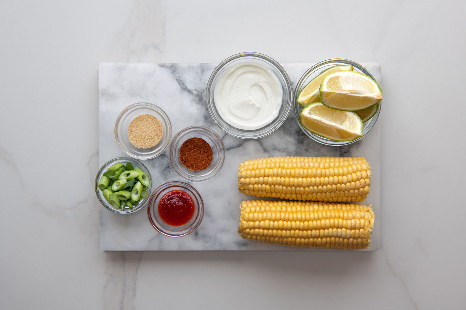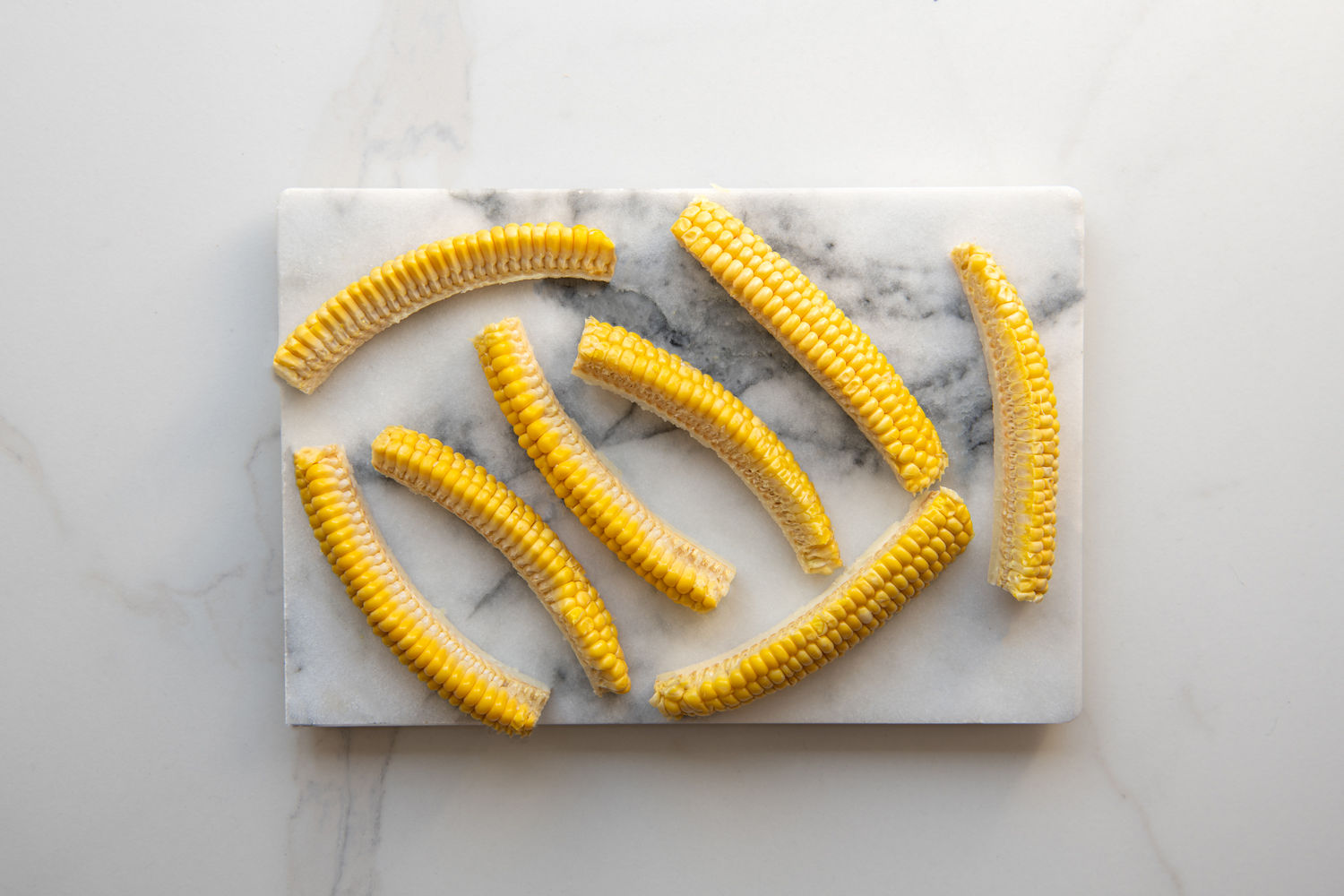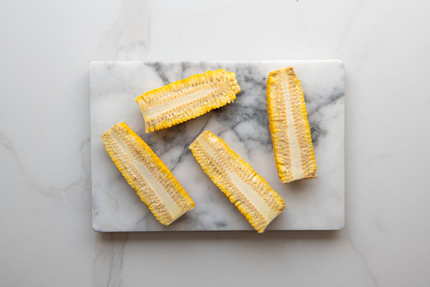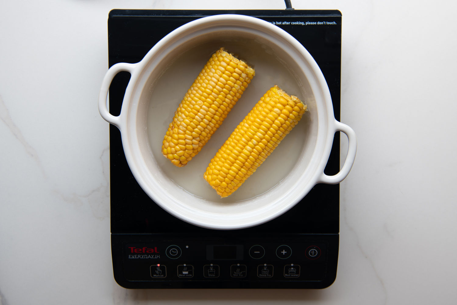 Get a pot of boiling water on-the-go and cook the corns whole for 6 minutes. Remove and set aside to cool.