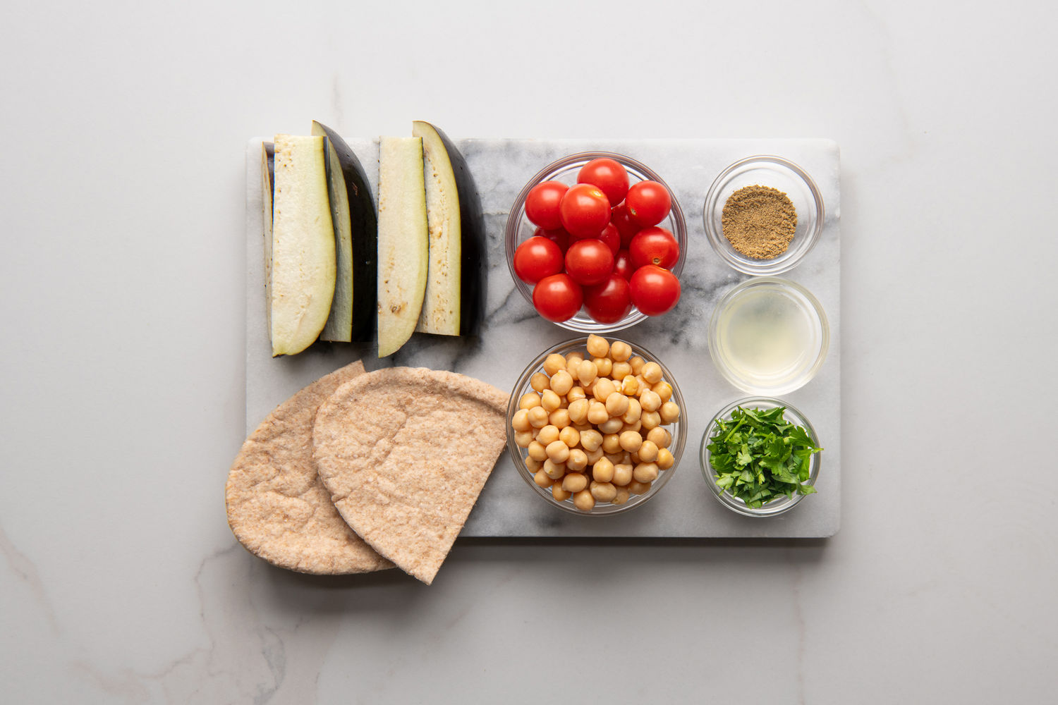 Air-Fried Aubergine, Tomato, Cucumber and Egg Pitta with Hummus and Tahini Dressing