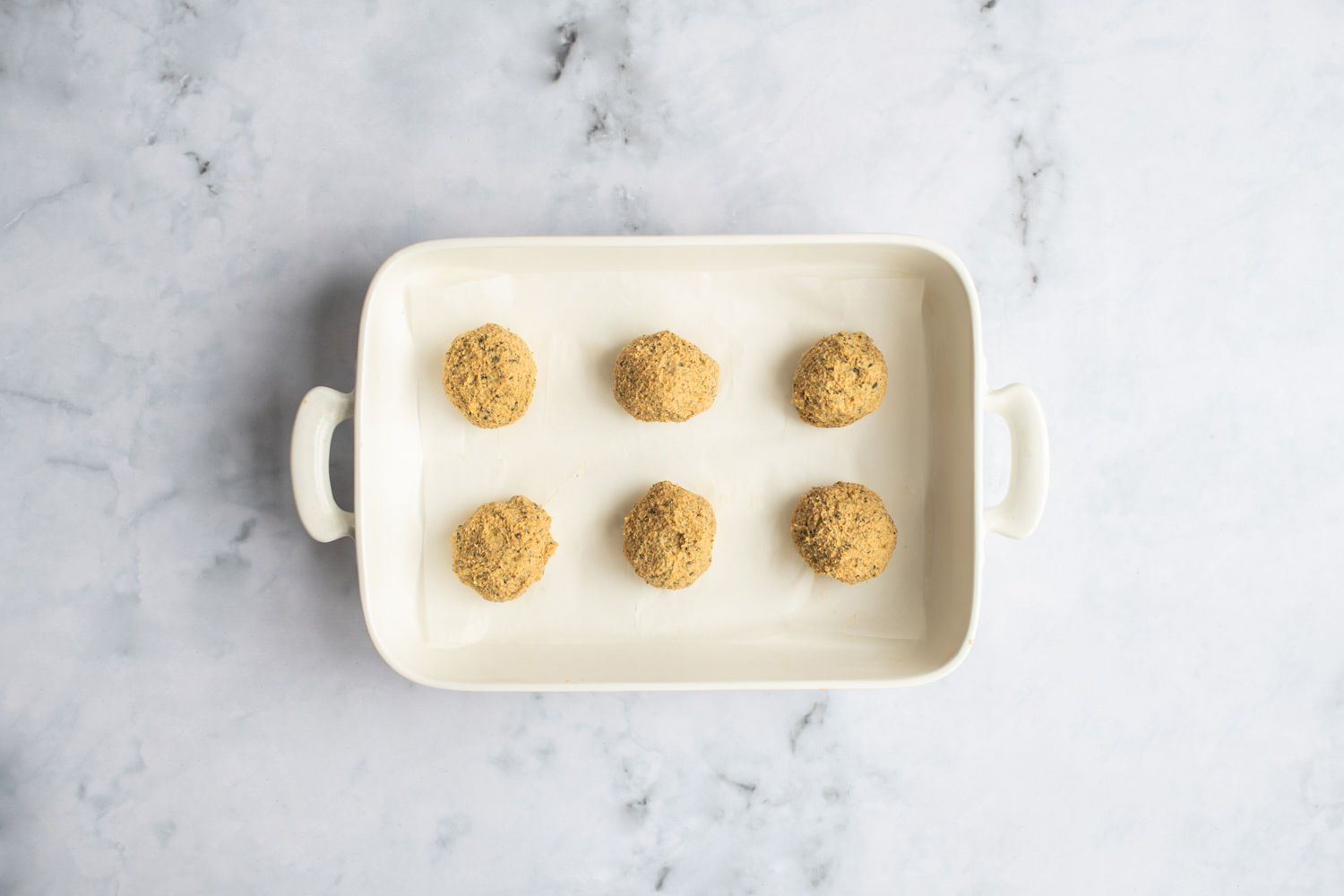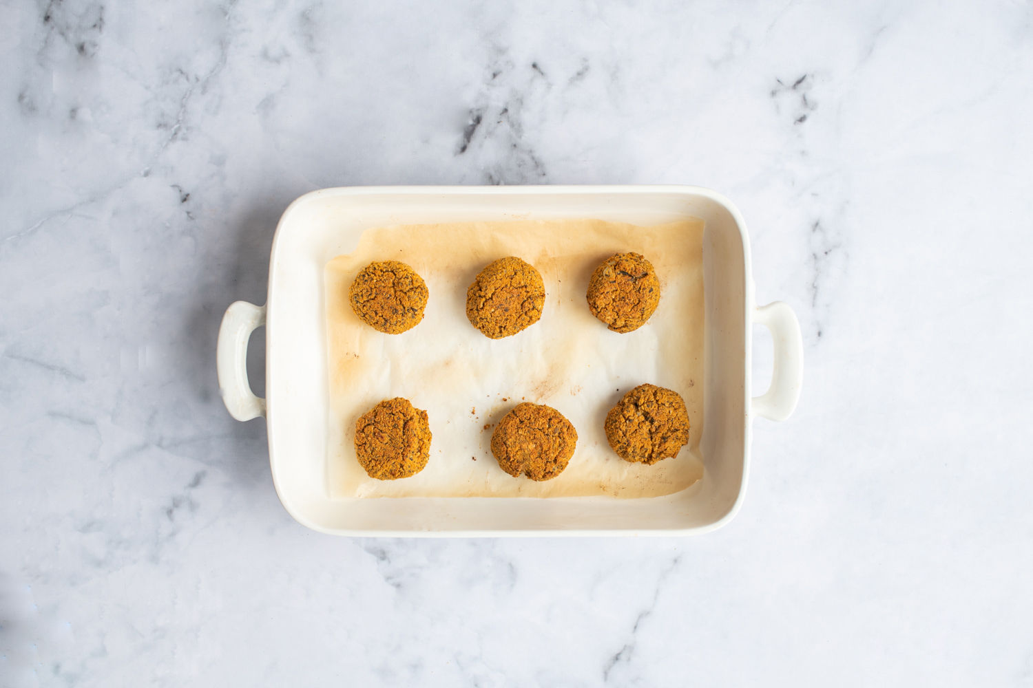 Use an ice cream scoop to make falafel balls and place them on the prepared baking parchment.