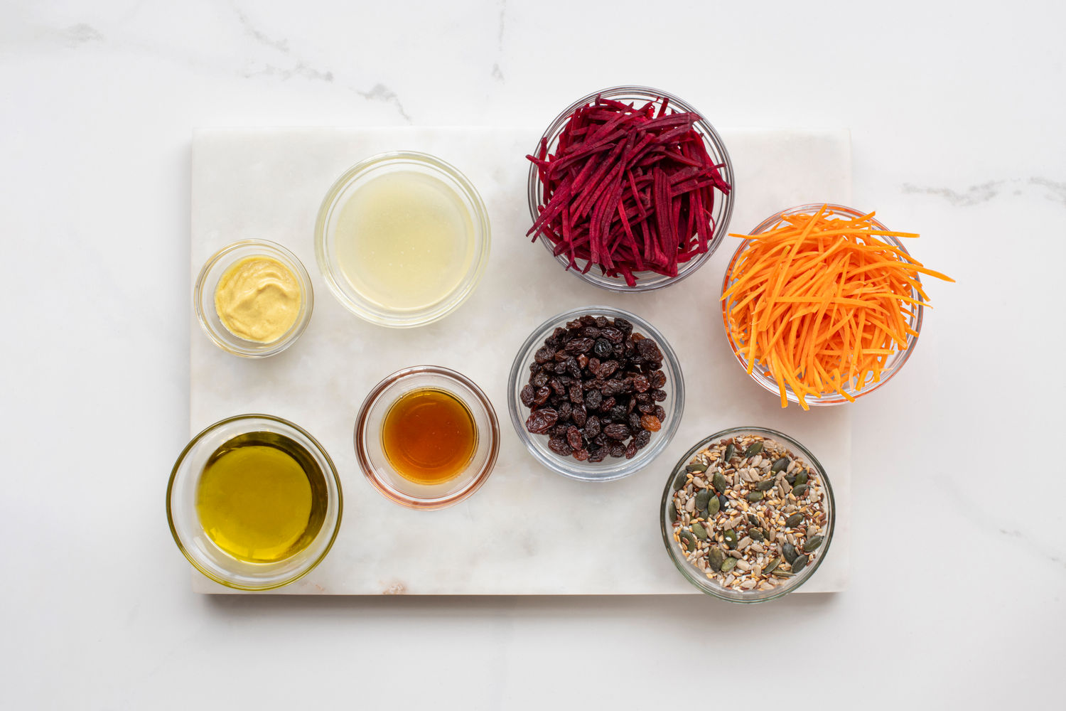 Even if beetroot isn’t usually your thing, this fresh, crunchy slaw might just change your mind. It’s a vibrant mix of sweet carrots and earthy beetro...ot, brought to life with a zingy lemon dressing and the occasional pop of sweetness from raisins. If you can julienne the veg instead of grating or peeling, it gives the slaw an especially satisfying texture.You can use a mandolin, julienne peeler, or slicing attachment for a food processor to help with this. Read more Even if beetroot isn’t usually your thing, this fresh, crunchy slaw might just change your mind. It’s a vibrant mix of sweet carrots and earthy beetroot, brought to life with a zingy lemon dressing and the occasional pop of sweetness from raisins. If you can julienne the veg instead of grating or peeling, it gives the slaw an especially satisfying texture.You can use a mandolin, julienne peeler, or slicing attachment for a food processor to help with this.