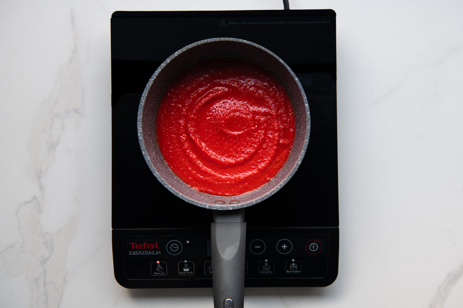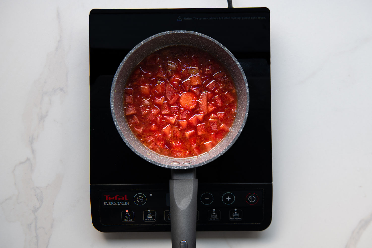 Add the chopped beetroot, apple and vegetable stock and cover. Bring to a simmer and allow to cook for 25-30 minutes, until the vegetables are completely tender.