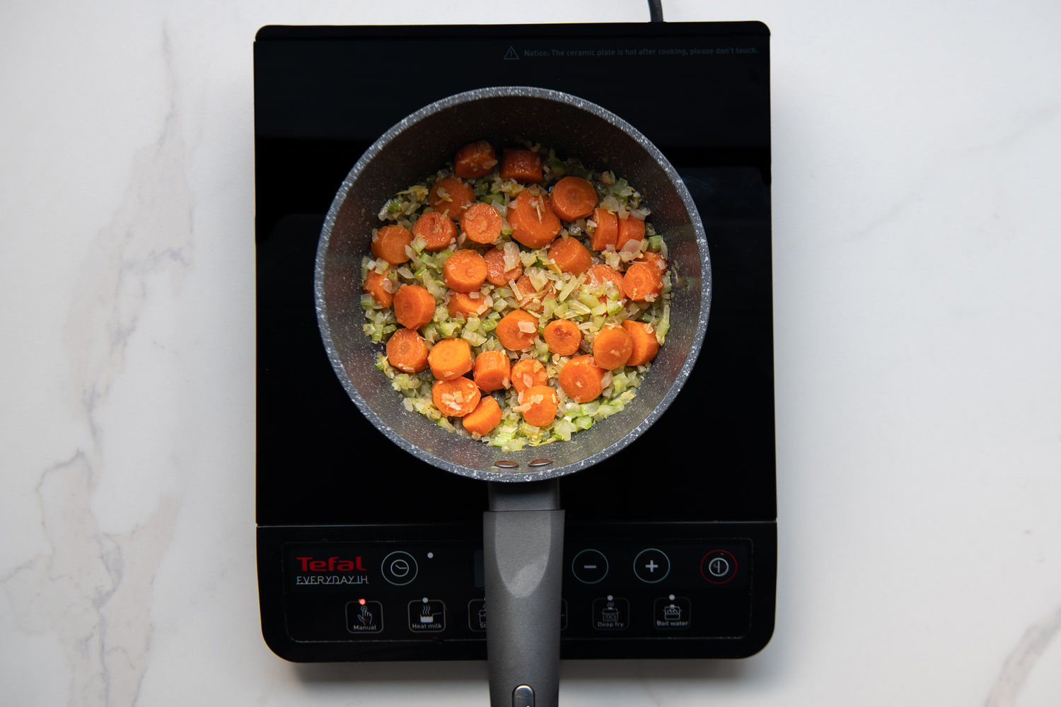 Place a large heavy-bottomed saucepan over a medium-high heat and add the olive oil. Once hot, add the onion, carrots, celery, garlic and ginger with a sprinkle of salt and pepper. Cook for 4-5 minutes, stirring often, until softened and translucent.