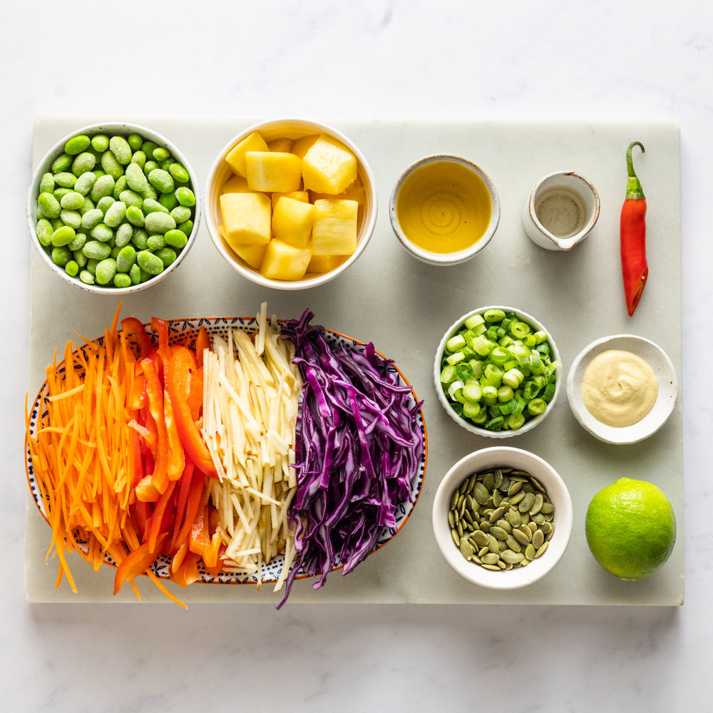 This might just be one of the most colourful salads you'll ever eat! We've loaded this slaw full of fibre rich veggies to enrich your digestive system...This might just be one of the most colourful salads you'll ever eat! We've loaded this slaw full of fibre rich veggies to enrich your digestive system and topped it off with a zingy mango dressing that you'll make time and time again. The addition of the toasted pumpkin seeds adds a roasty depth whilst providing heaps of selenium and anti-inflammatory fats to protect against cell damage - a perfect bowl of nutritious ingredients! Read more This might just be one of the most colourful salads you'll ever eat! We've loaded this slaw full of fibre rich veggies to enrich your digestive system and topped it off with a zingy mango dressing that you'll make time and time again. The addition of the toasted pumpkin seeds adds a roasty depth whilst providing heaps of selenium and anti-inflammatory fats to protect against cell damage - a perfect bowl of nutritious ingredients! This might just be one of the most colourful salads you'll ever eat! We've loaded this slaw full of fibre rich veggies to enrich your digestive system and topped it off with a zingy mango dressing that you'll make time and time again. The addition of the toasted pumpkin seeds adds a roasty depth whilst providing heaps of selenium and anti-inflammatory fats to protect against cell damage - a perfect bowl of nutritious ingredients!