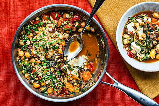 This one-pan fish dish is easy enough to cook for a weeknight dinner but elegant enough to make for guests. The better your chickpeas, the better this... dish will taste. We recommend using a jar as those tend to be more tender and have a richer flavour. Read more This one-pan fish dish is easy enough to cook for a weeknight dinner but elegant enough to make for guests. The better your chickpeas, the better this dish will taste. We recommend using a jar as those tend to be more tender and have a richer flavour.