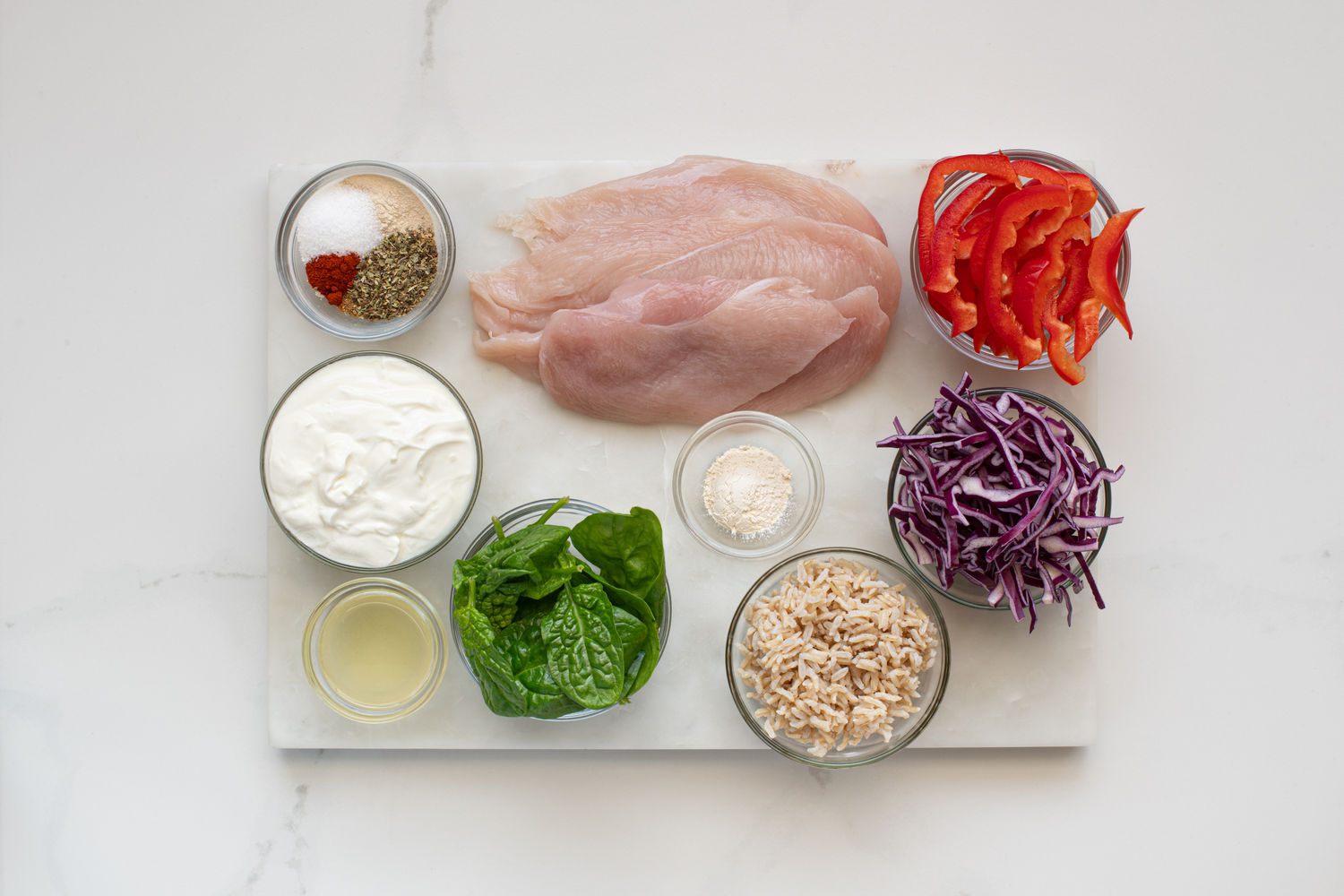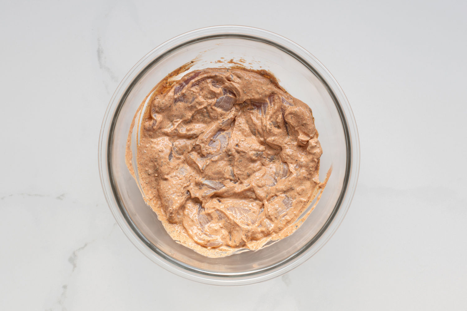 To marinade the chicken, whisk together the cumin, paprika, coriander, garlic powder, dried oregano, garlic powder and salt. Add the yoghurt and lemon juice and stir to combine.