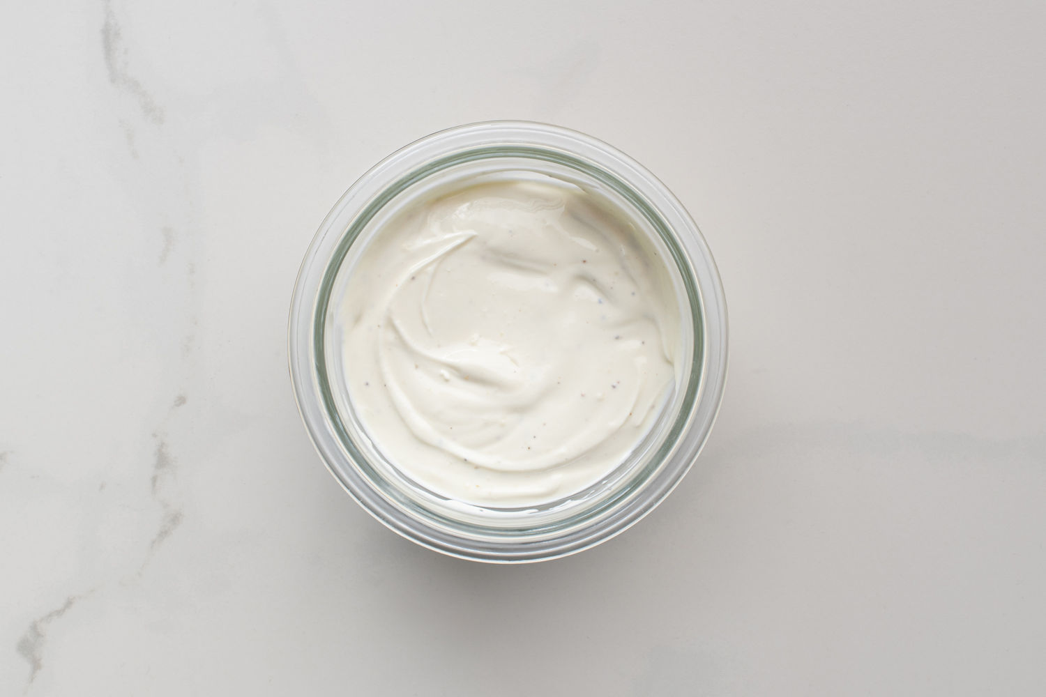 Mix together the remaining yoghurt and garlic powder. Add salt and pepper to taste.