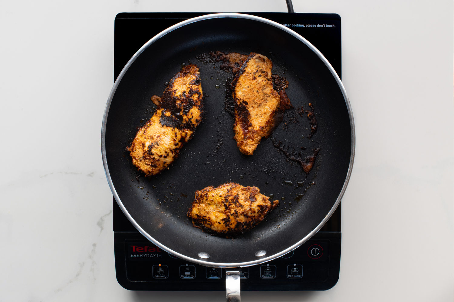 Heat a frying pan over medium-high heat. Add half of the olive oil and chicken pieces. Allow to cook for 4-5 minutes on each side, allowing it to turn dark golden brown before flipping. Remove onto a clean chopping board.