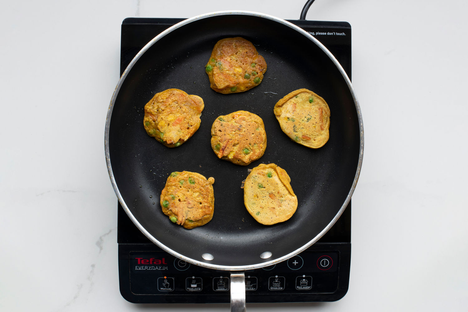 Heat a frying pan over medium-high heat. Add spoonfuls of batter and cook for 3-4 minutes on each side, until fully cooked. Allow to cool before serving. We used a tablespoon measure to ensure evenly sized fritters.