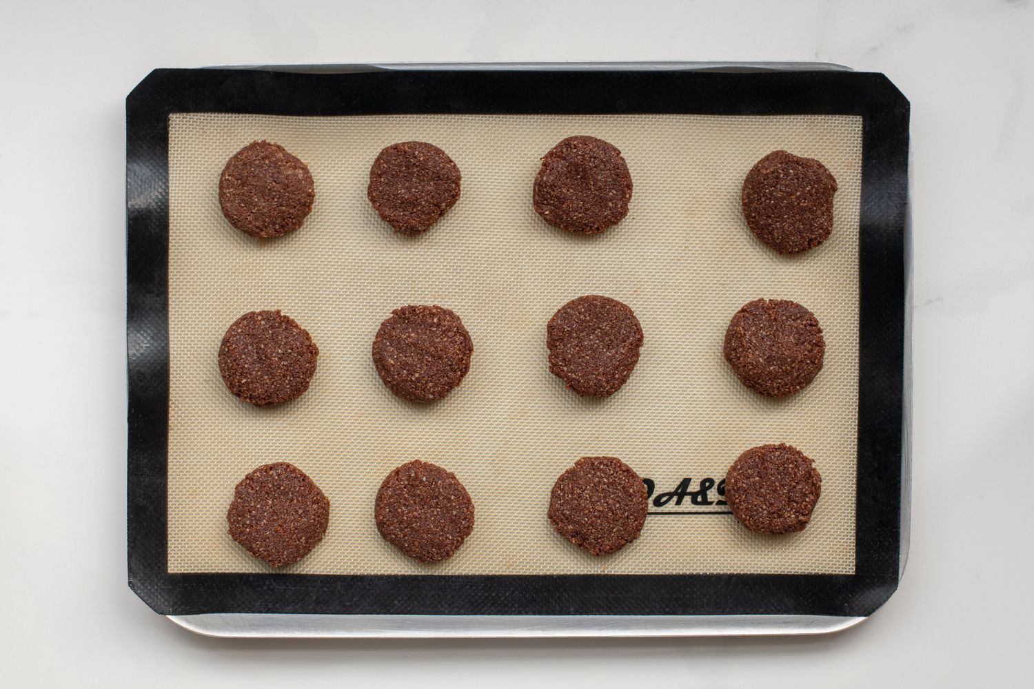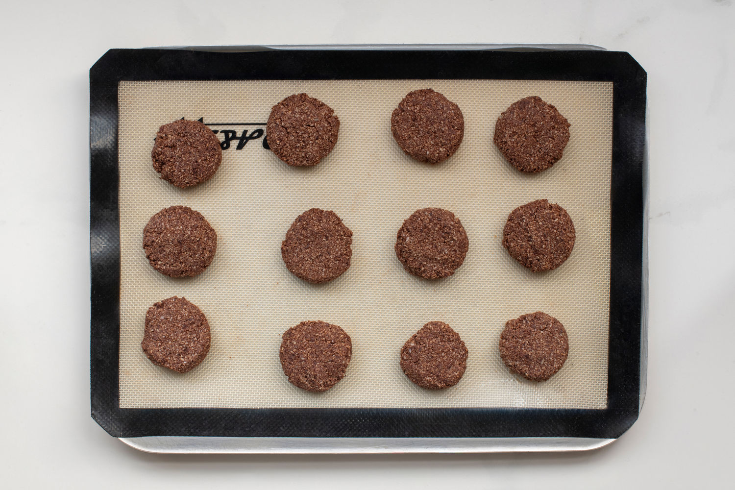 Shape into balls, using about 2 tablespoons of mixture per cookie. Flatten slightly and place onto your prepared baking tray. If you find the mixture sticks to your hands, dip them in water before shaping each cookie.