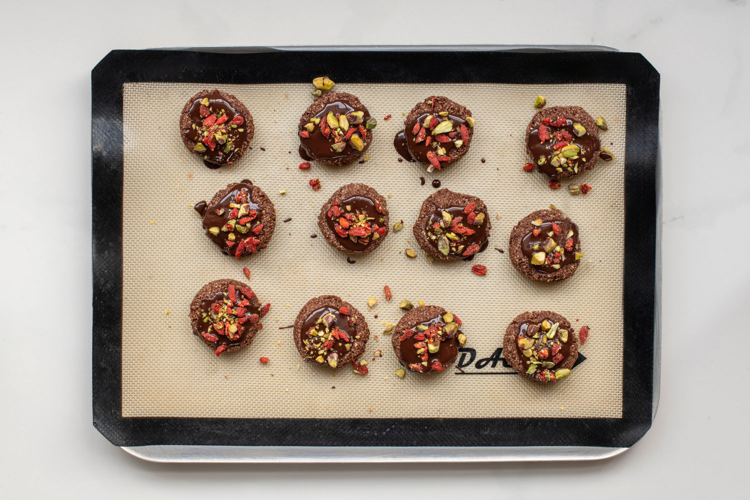 Spread some chocolate on top of each cookie and sprinkle with pistachios and goji berries.