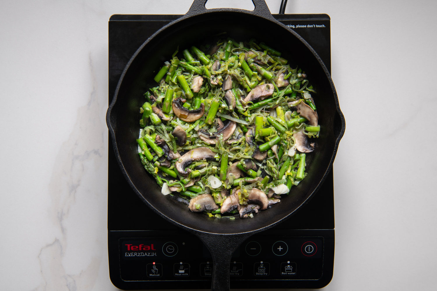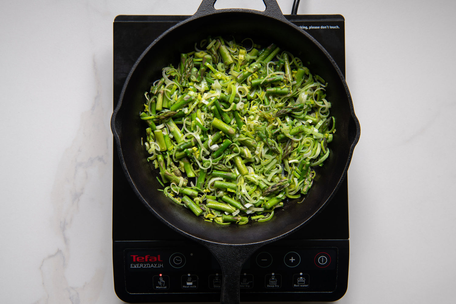 Heat most of the oil in a large frying pan and add the leeks and asparagus with a pinch of salt. Fry over a medium heat for 5 minutes.