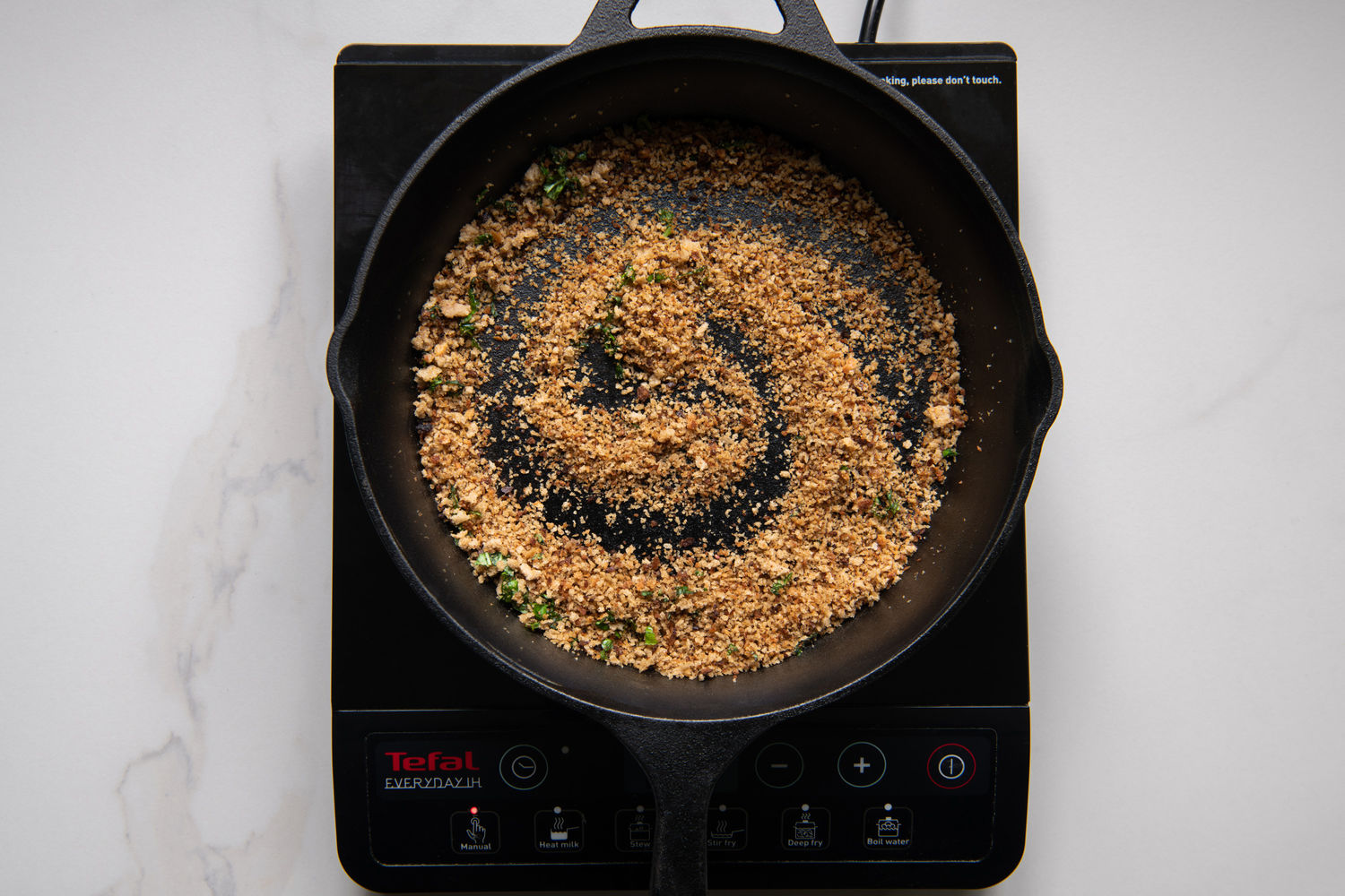 In a separate pan, heat the remaining oil and fry the rye breadcrumbs until crispy. Remove from the heat, cool and add the chopped basil.
