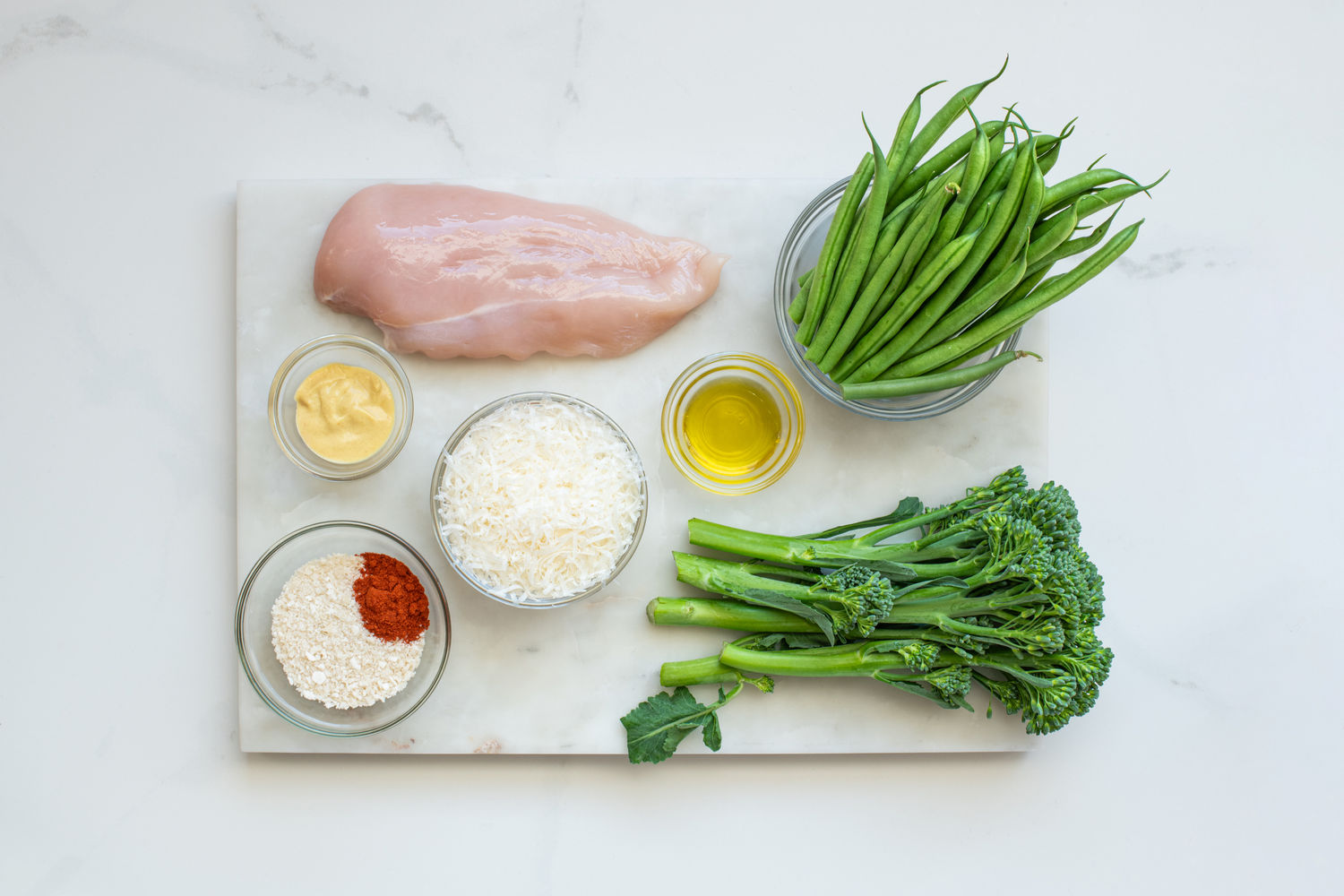 We love chicken schnitzel but not the mess it makes. In this open-faced alternative simply brush thinly sliced chicken breasts with mustard and top with parmesan enriched breadcrumbs. It’s important to slice the chicken thinly, it not only guarantees the chicken and vegetables will cook in the same amount of time, it means each bite of chicken will have the right ratio of topping to meat.
