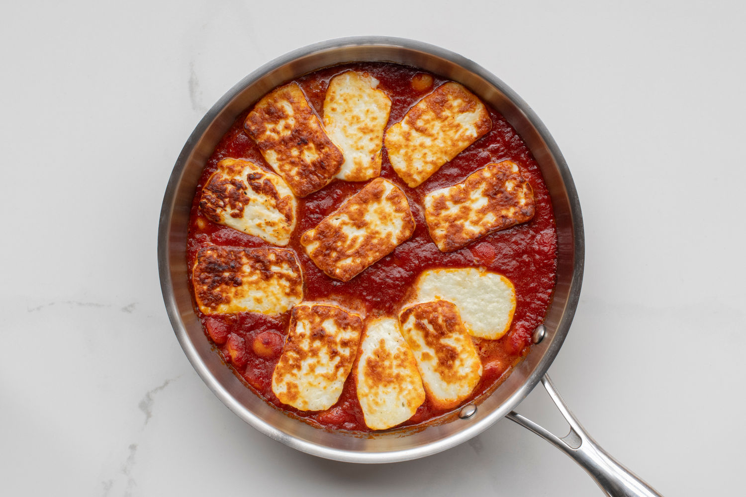 While the beans are cooking, preheat your grill to medium-high. Arrange the halloumi slices over the beans. Place under the grill and cook for about 5-6 minutes, until golden and bubbly. Keep an eye on it during cooking as timing will depend on the strength of your grill.