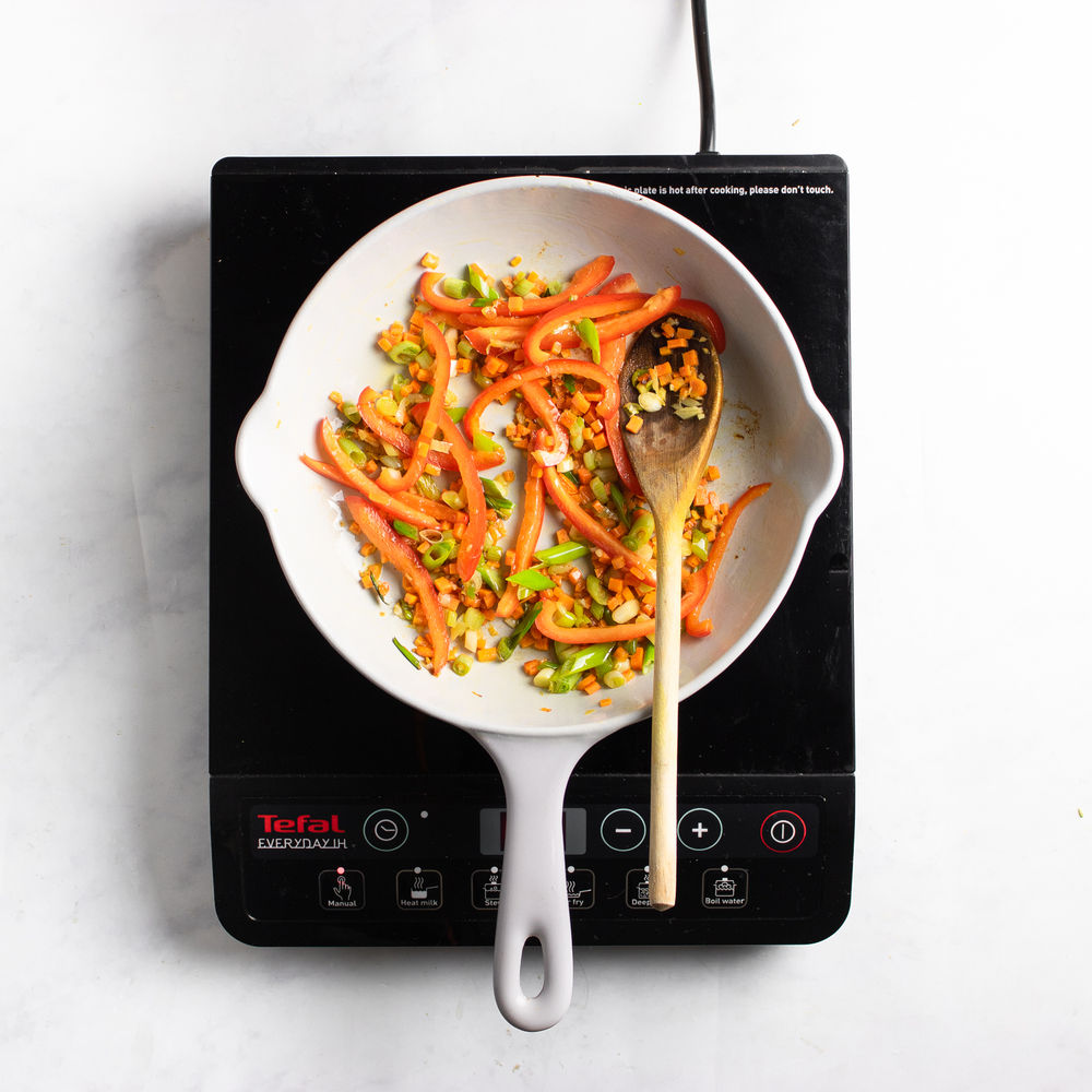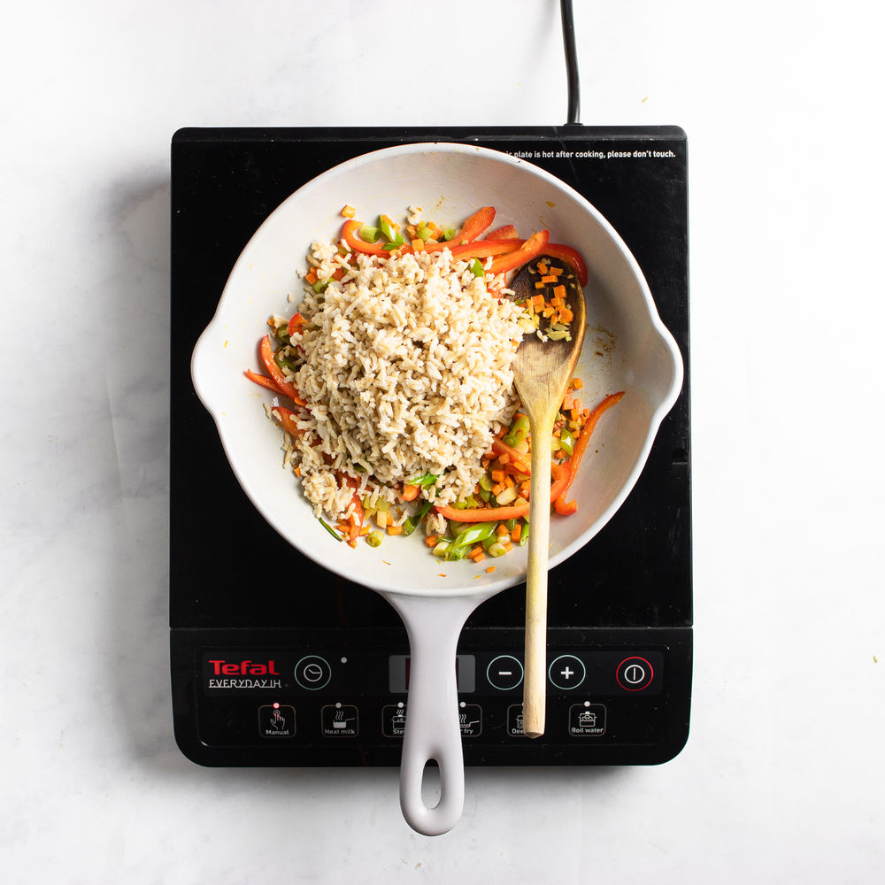 A super quick and satisfying fried rice recipe, bolstered with vegetables, plenty of protein from the eggs, served with a fiery sauce. A super quick and satisfying fried rice recipe, bolstered with vegetables, plenty of protein from the eggs, served with a fiery sauce.
