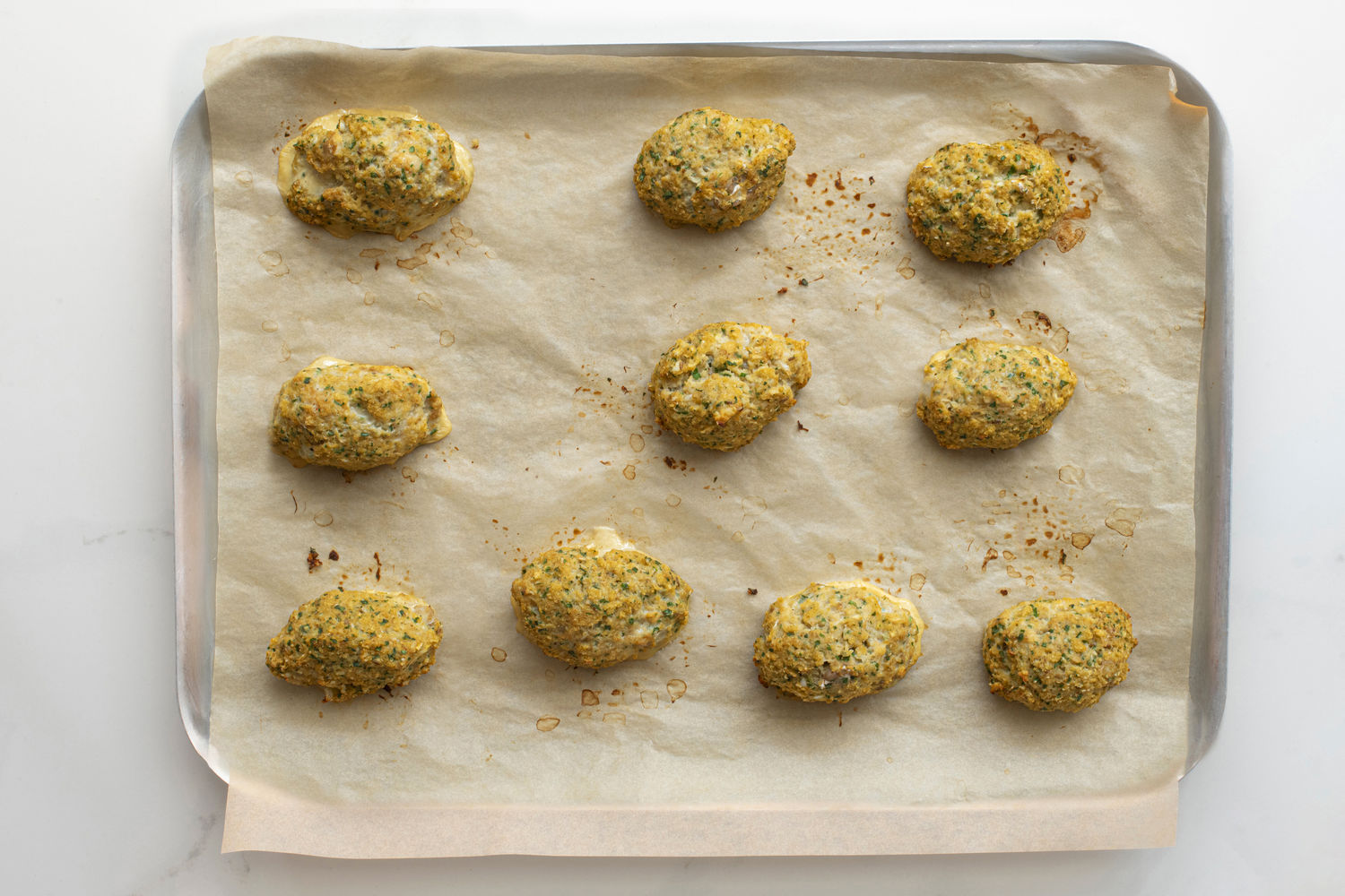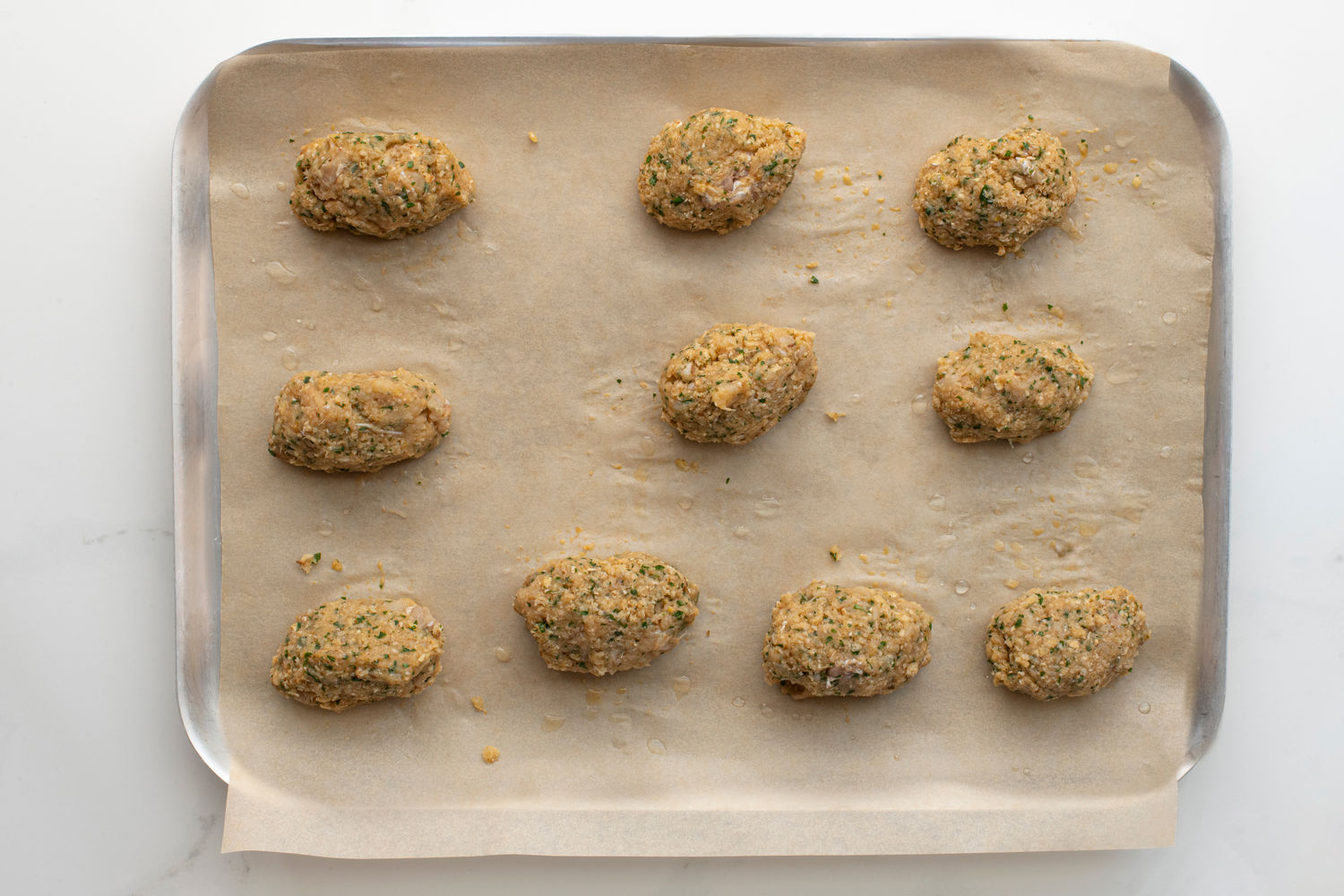 With damp hands, take pieces of the mixture about the size of golf balls, using about 50g of mix, and shape into ovals.