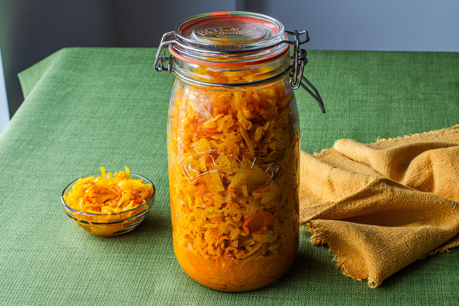 Close the lid and place in a cool, dark place (the back of a kitchen cupboard is ideal). You can taste the sauerkraut as soon as you like, but it will probably take at least one week. It is ready when you think it tastes delicious. At that stage, decant into a smaller container and place in the refrigerator to halt the fermentation process. The vegetables will absorb the turmeric as they ferment and turn a more vibrant shade of yellow.