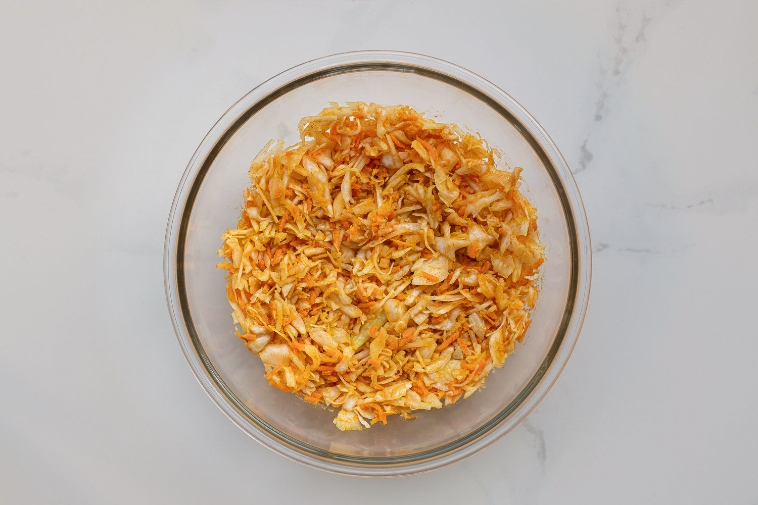Place the cabbage and carrot, into a large bowl and pour over the slurry. Massage into the vegetables, using clean hands, for about 5-6 minutes, until they are loose, floppy and have released some liquid. They should reduce in volume by about half. Stir through the dried turmeric.