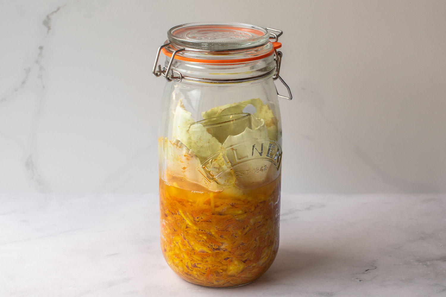 Place the shredded vegetables into a large clip-top jar and pour over the liquid. You should have enough liquid to cover the vegetables - if not, return to the bowl and massage for a few more minutes. If needed, add a small splash of water. Cover with the reserved outer cabbage leaves and place a small ‘weight’ on top’ ie a small jar, glass or ramekin. Make sure that the vegetables are completely submerged in liquid, as anything left exposed to air could grow mould. If you forgot to reserve cabbage leaves, you can use a piece of parchment paper.