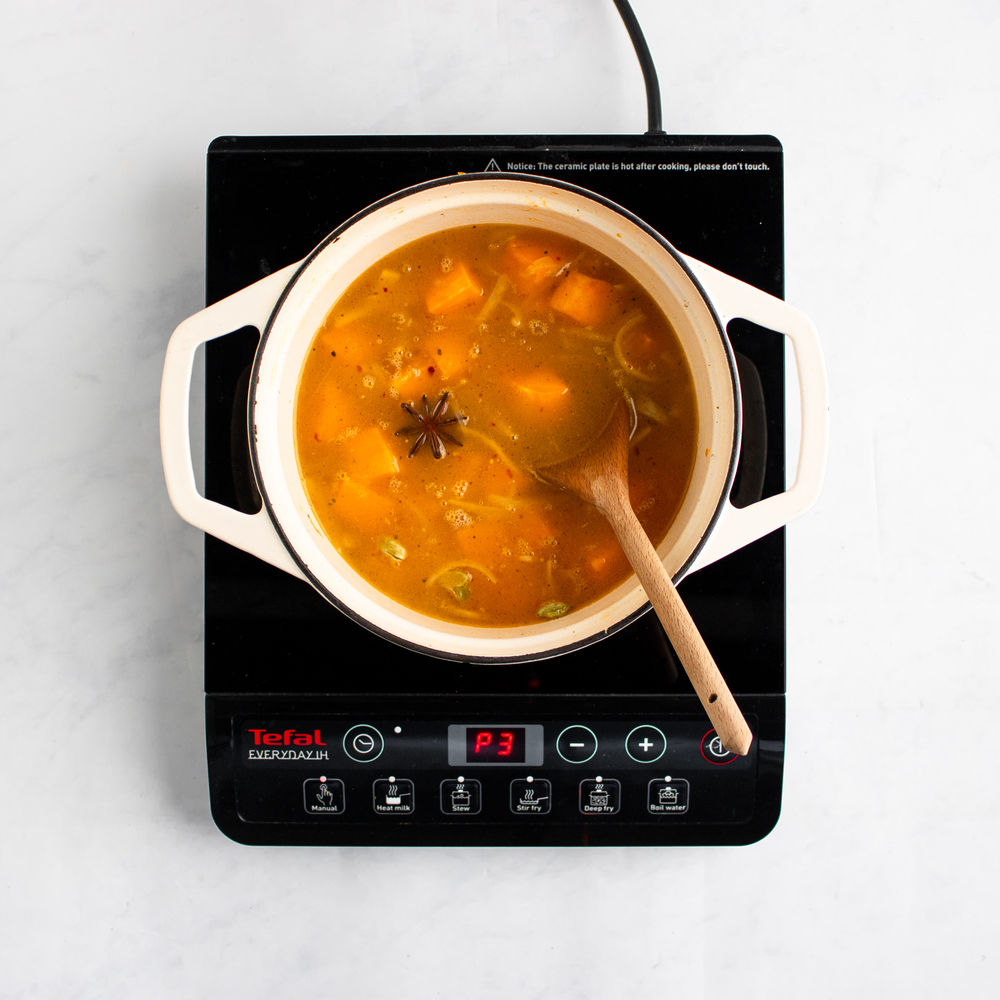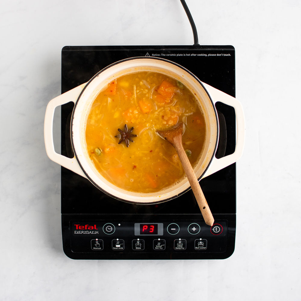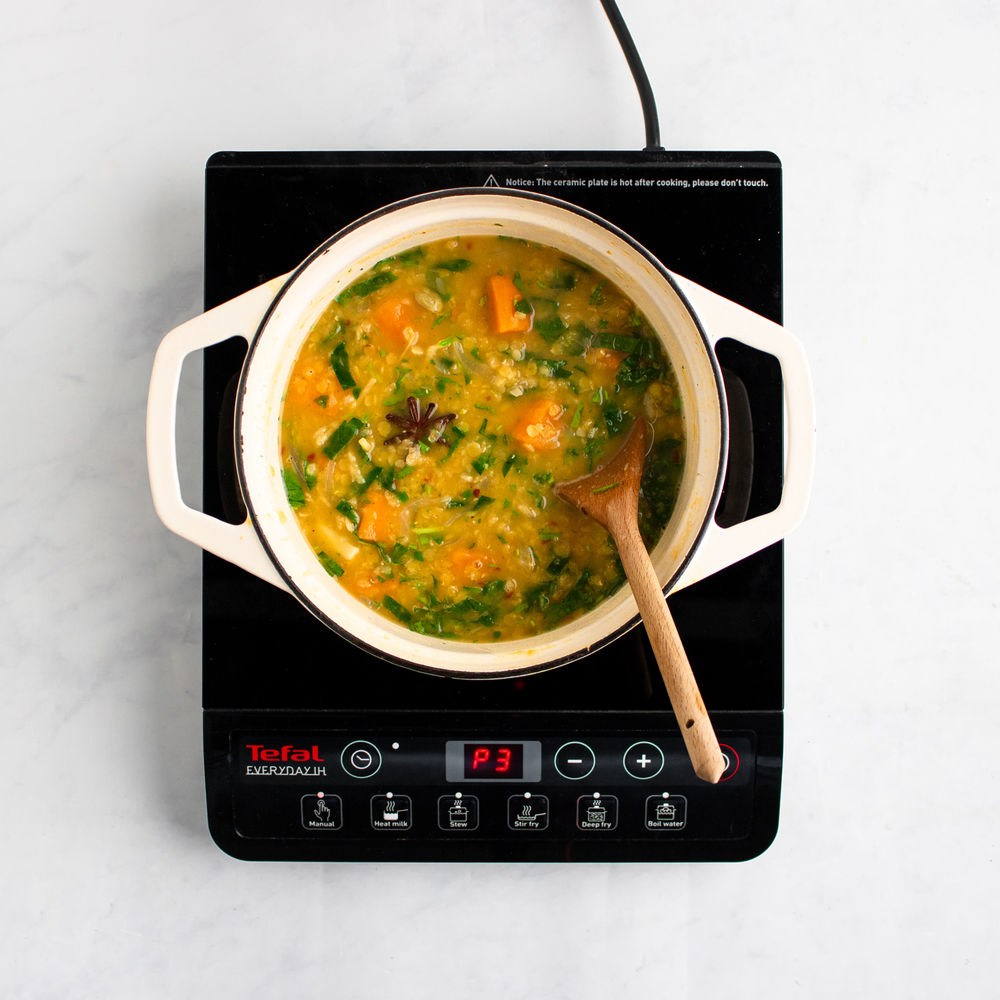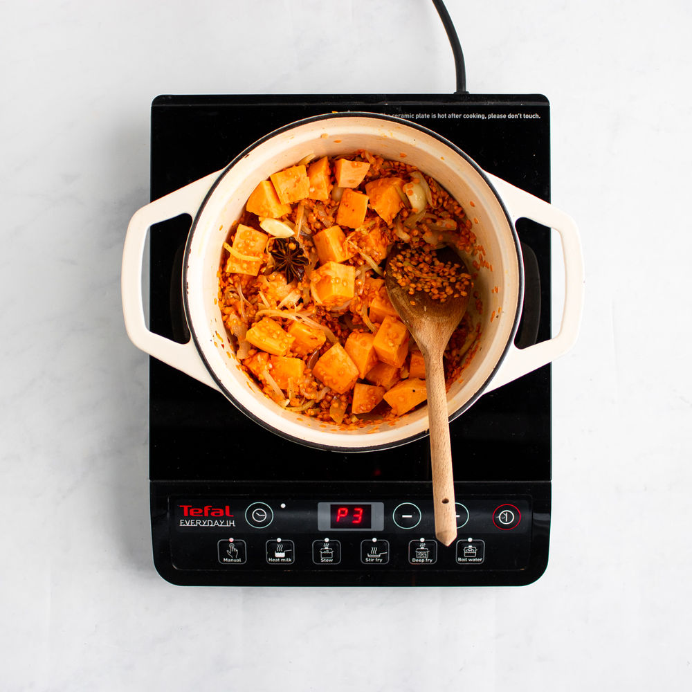 Add the stock and stir, then put the lid on and simmer for 30 minutes until the potato is soft and the lentils are cooked through. Add a little extra water if needed.