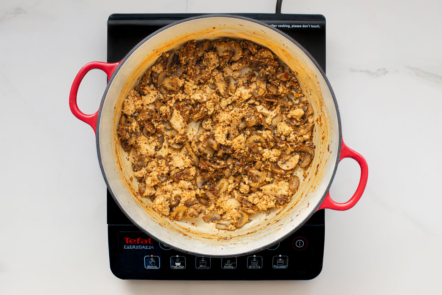 Then add the garlic, oregano, tomato puree, chilli flakes, if using, and tofu. Cook for 2-3 minutes until fragrant and sizzling.