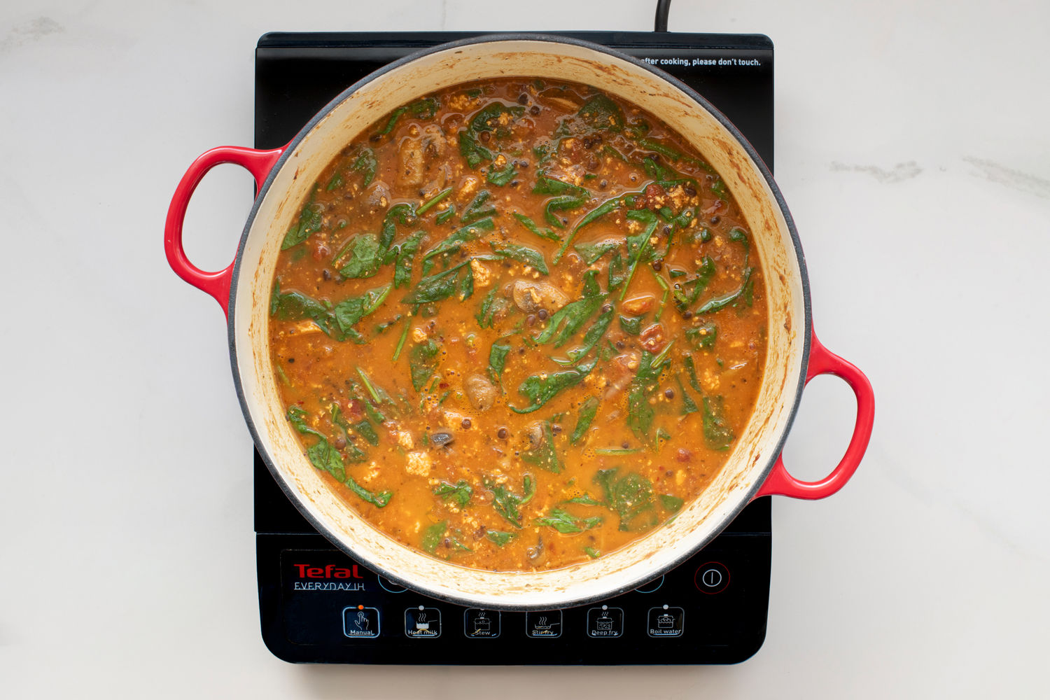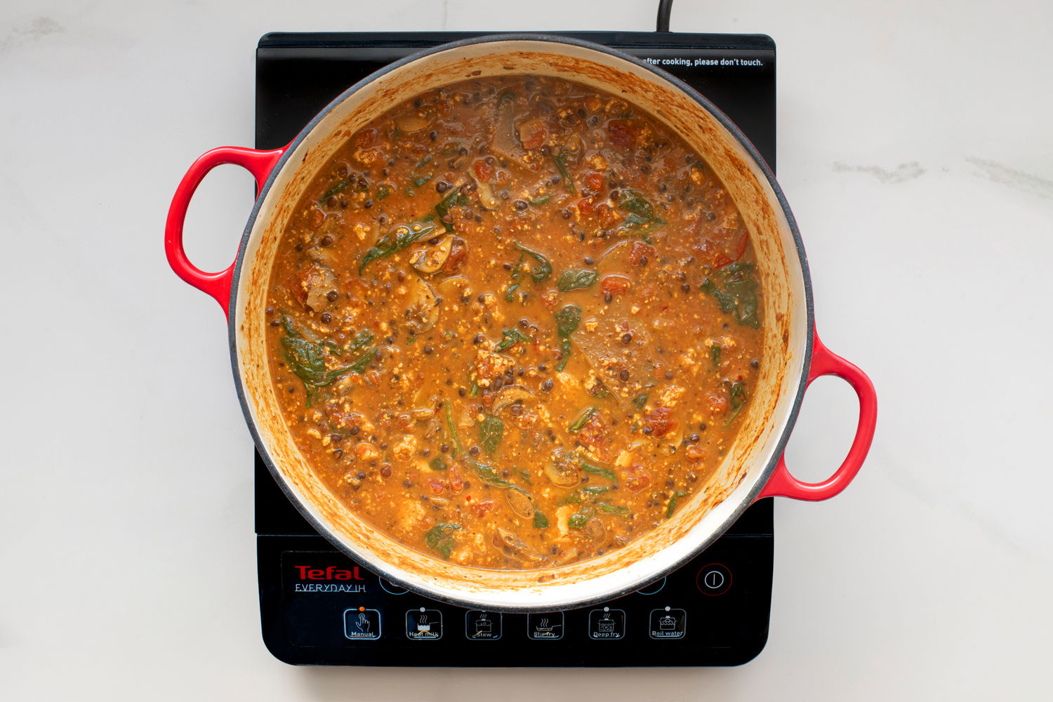 Add the balsamic vinegar, nutritional yeast, tinned tomatoes, spinach, lentils, and vegetable stock. Cook for 15-20 minutes, stirring occasionally, until darkened and reduced.