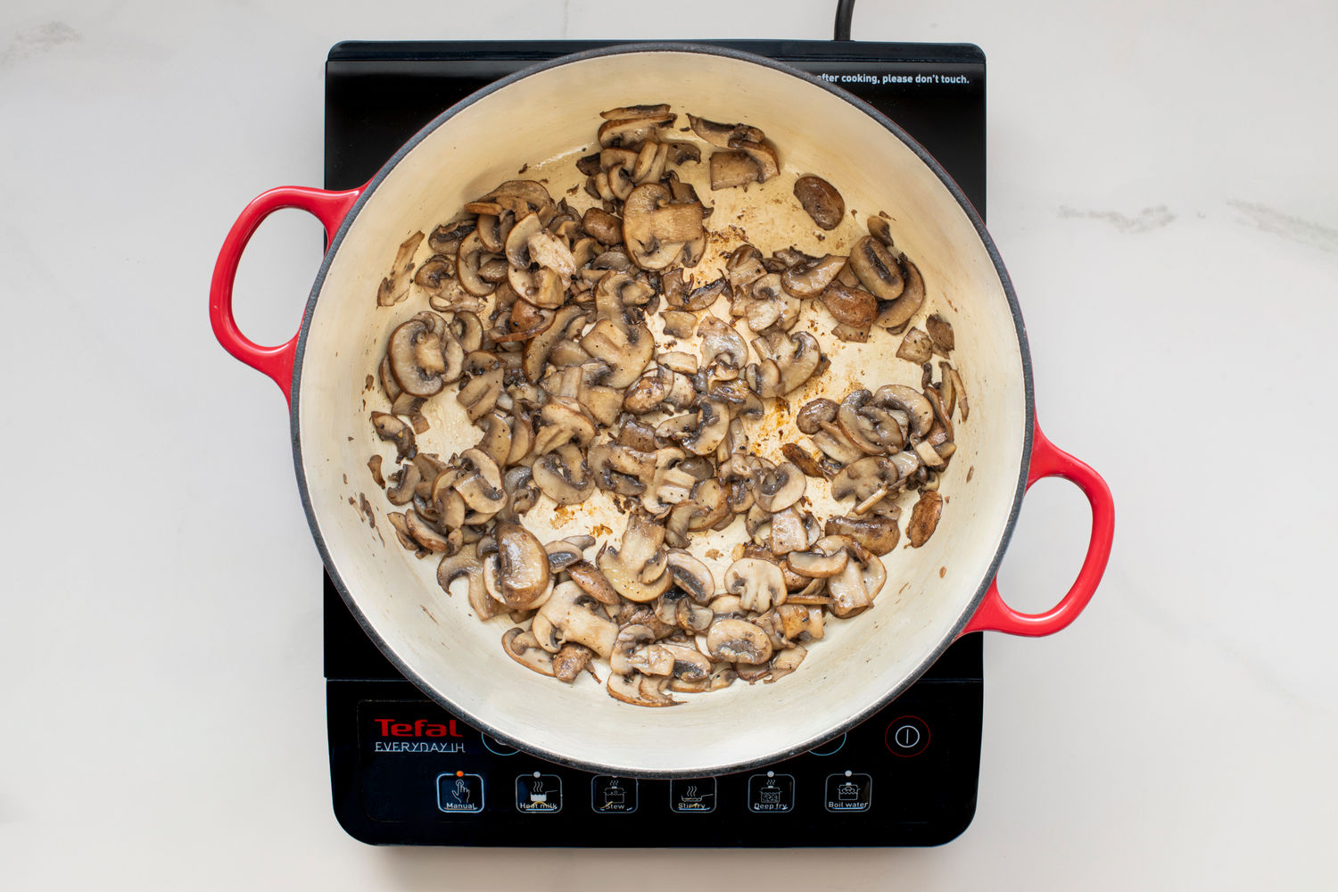 Heat the olive oil in a large heavy-bottomed pan and add the mushrooms with a pinch of salt and pepper. Cook, stirring occasionally for 8-10 minutes, until darkened and reduced.