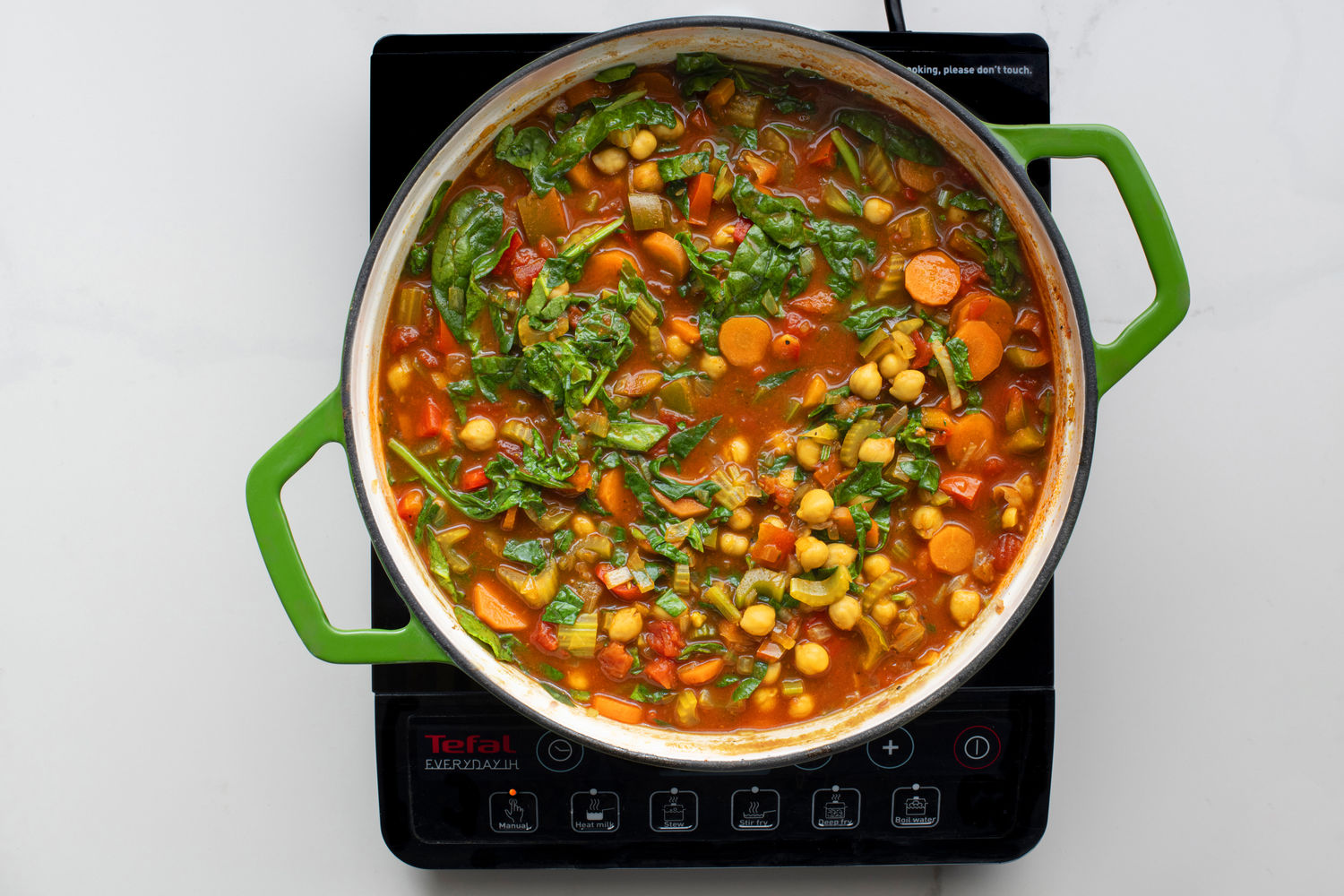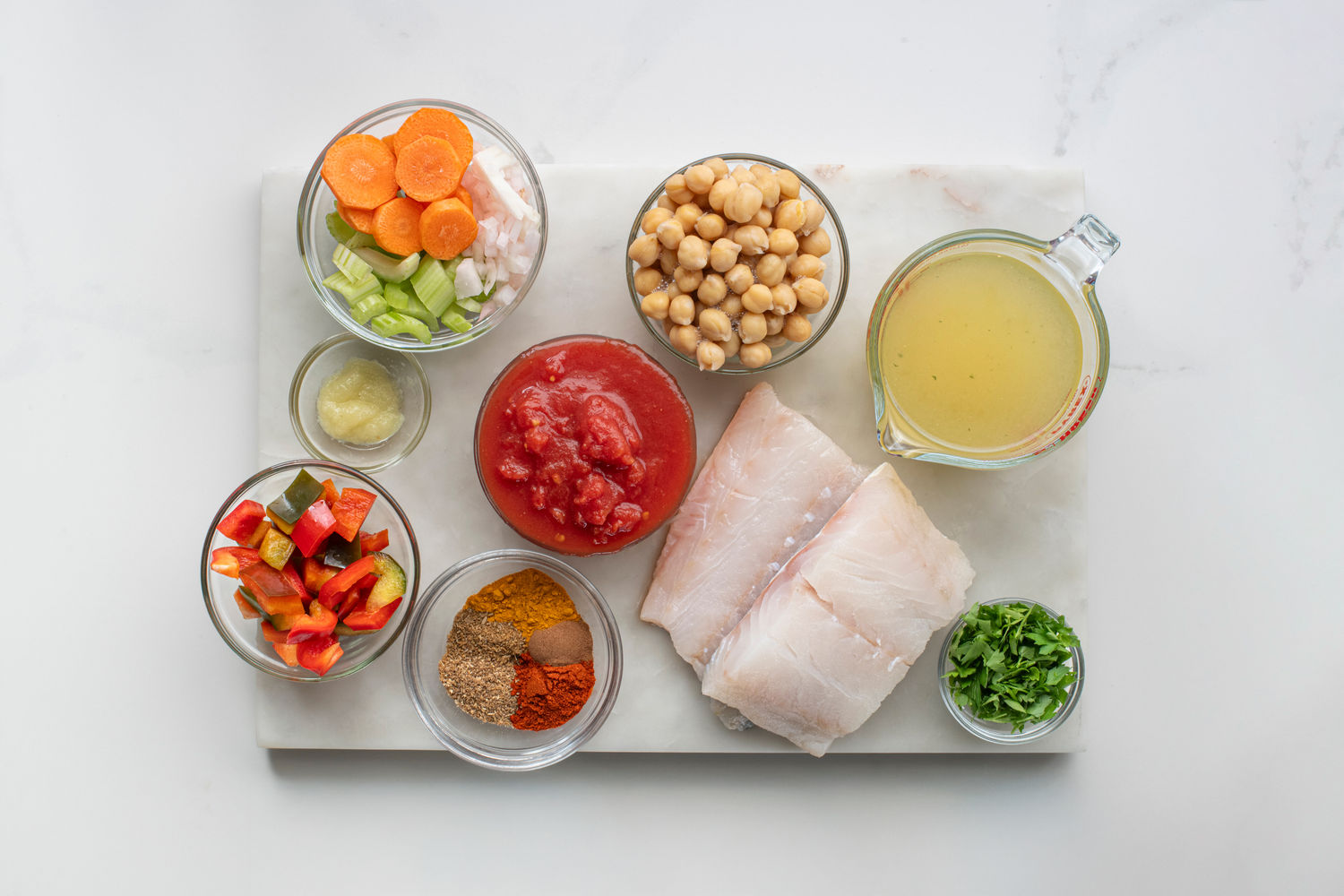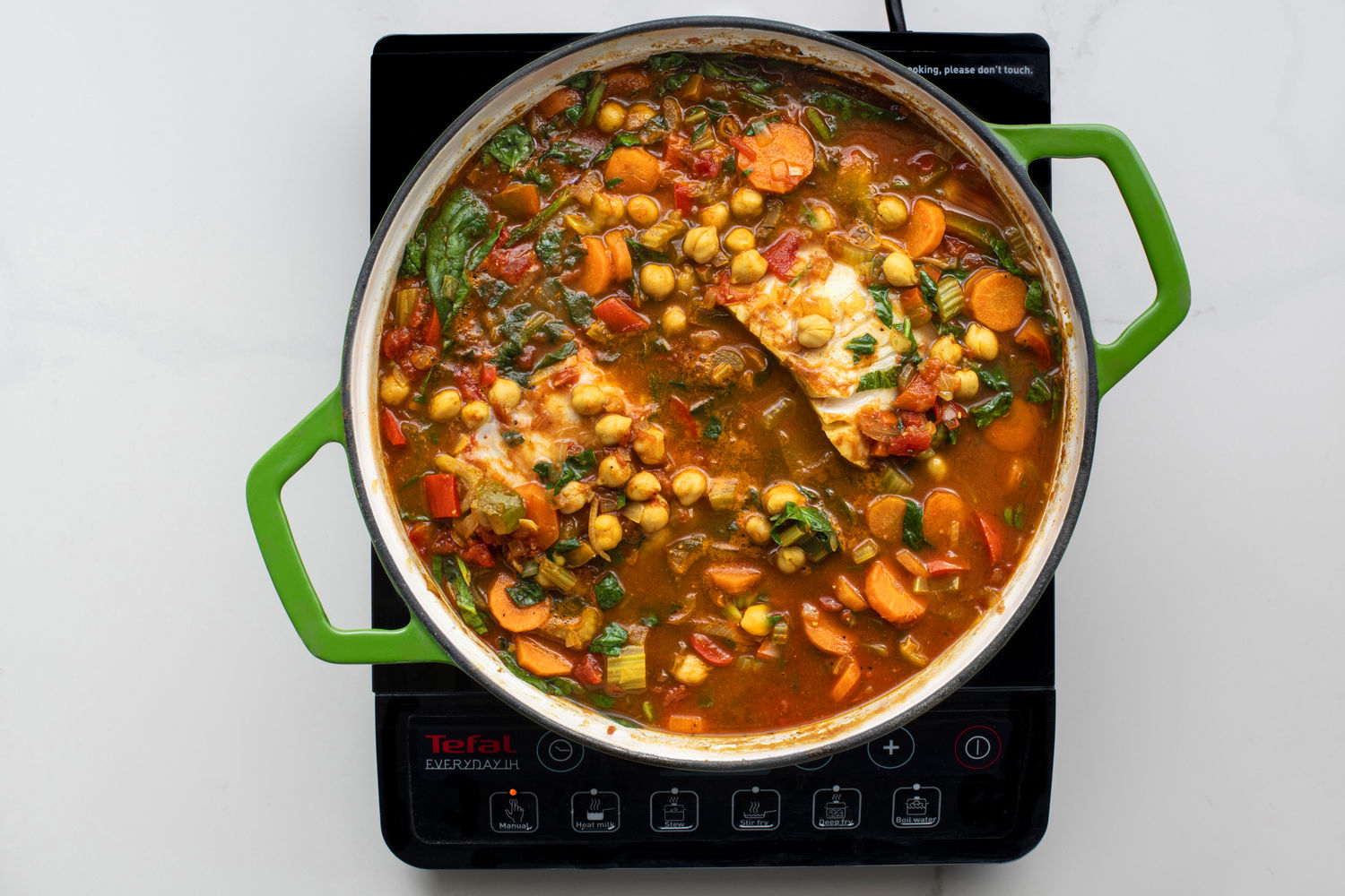 This fragrant, comforting stew is full of warming spices, hearty chickpeas, and tender vegetables. The cod gently poaches in a rich, spiced tomato sau...ce, soaking up all the flavour. Serve it simply with couscous, bulgur, or warm flatbreads—or enjoy it on its own as a lighter meal. Read more This fragrant, comforting stew is full of warming spices, hearty chickpeas, and tender vegetables. The cod gently poaches in a rich, spiced tomato sauce, soaking up all the flavour. Serve it simply with couscous, bulgur, or warm flatbreads—or enjoy it on its own as a lighter meal.