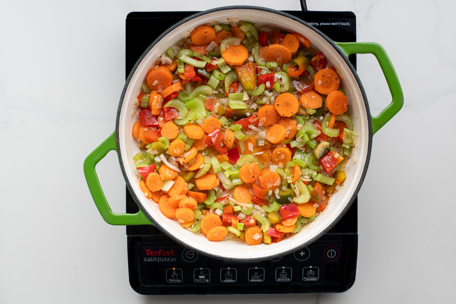 Heat the olive oil in a large pot over medium heat. Add the onion, pepper, carrot, and celery, and cook for 4-5 minutes, until softening.