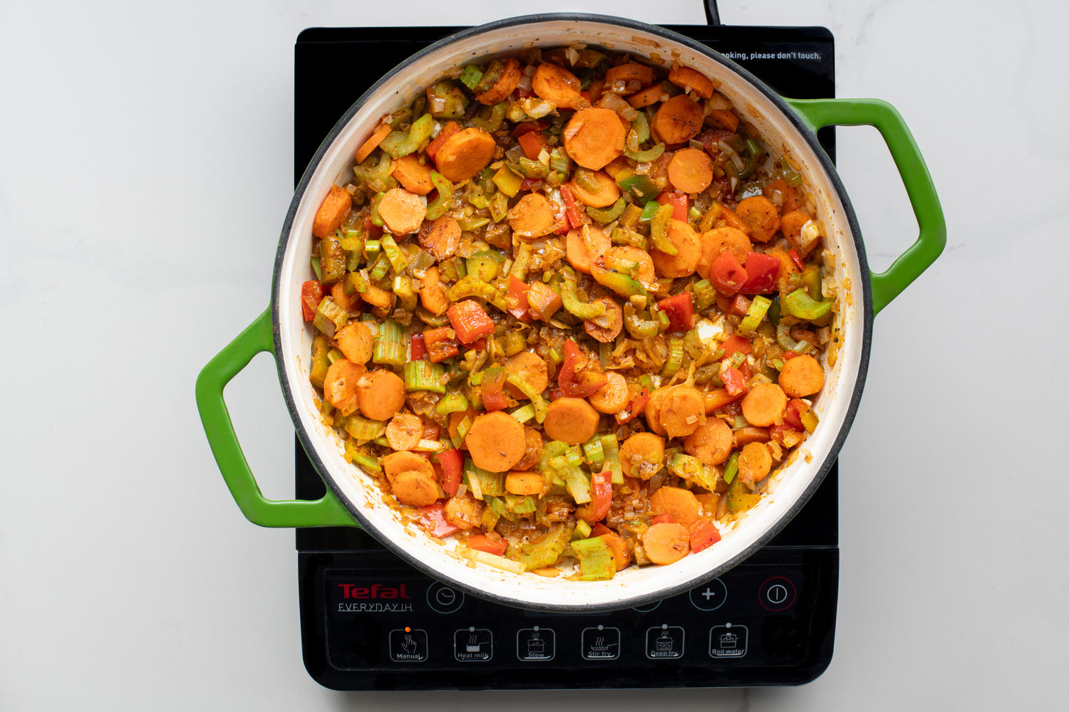 Pour in the chopped tomatoes, chickpeas and vegetable stock. Bring to a simmer and cook for 12-15 minutes, until darkened and reduced.