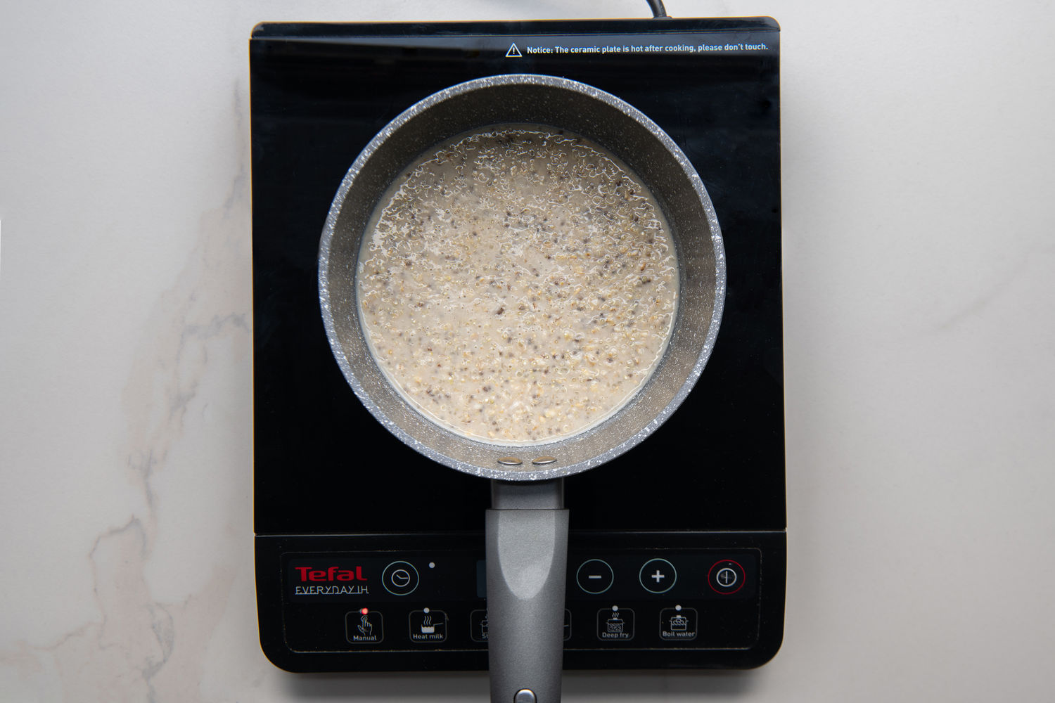 Add the oats, chia seeds, plant based milk and cinnamon and cook for a further 4-5 minutes, stirring often, until smooth and creamy.