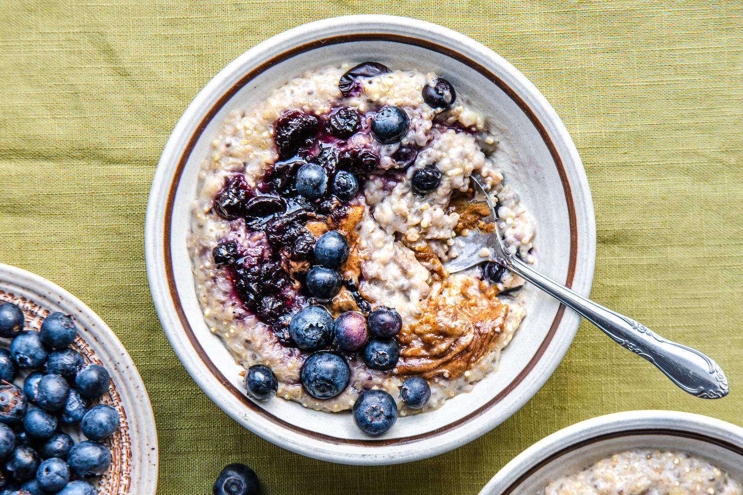 Serve the porridge in bowls topped with the remaining blueberries and a drizzle of almond butter.