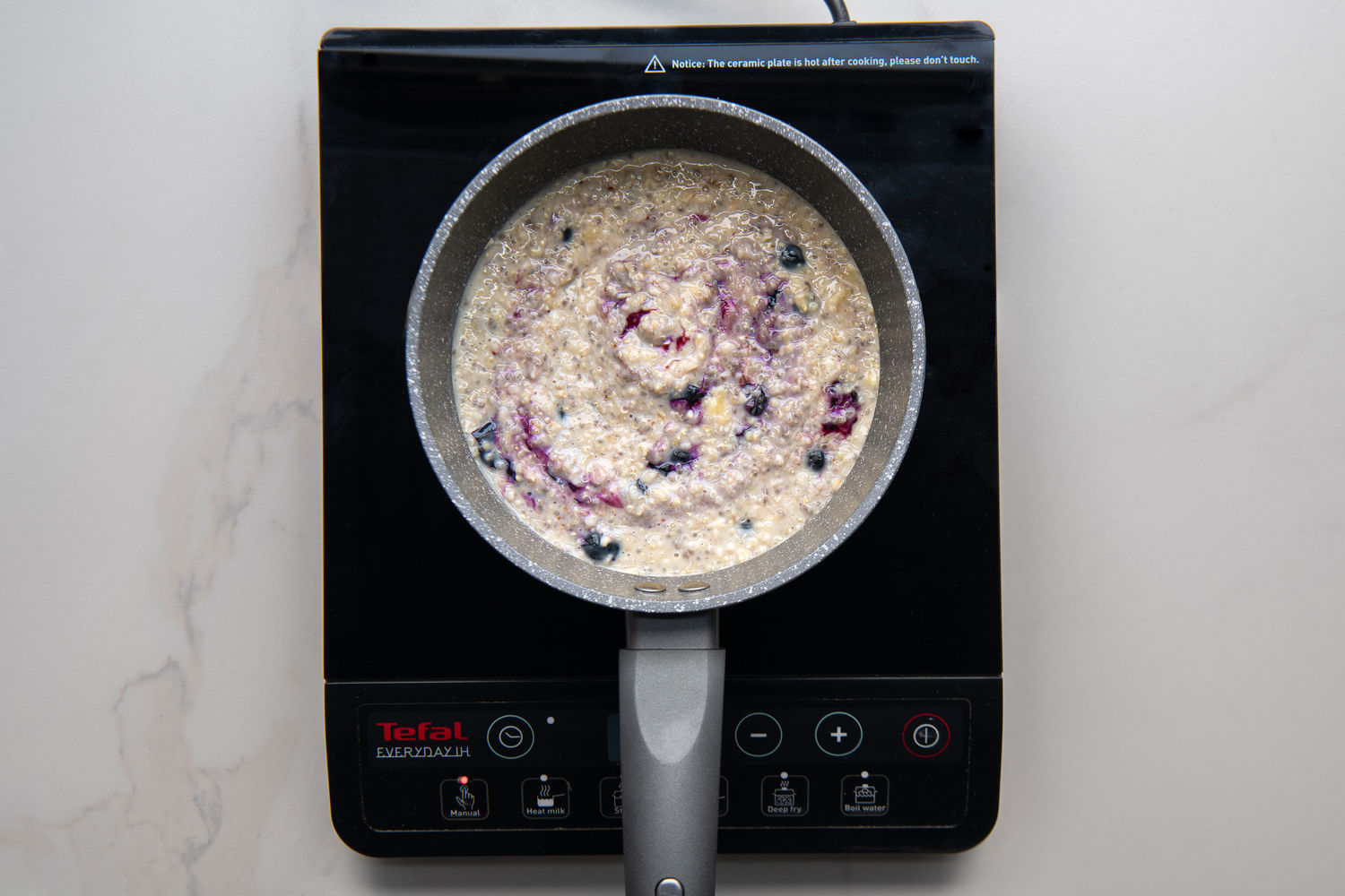 Then gently mix the banana and most of the blueberries through the porridge. Cook for a further 1-2 minutes, until the berries are beginning to burst.