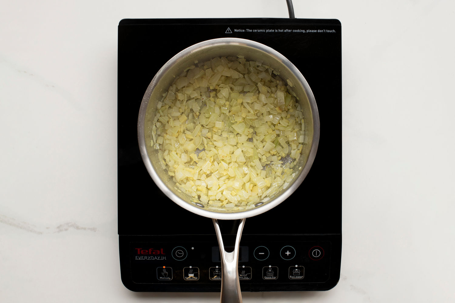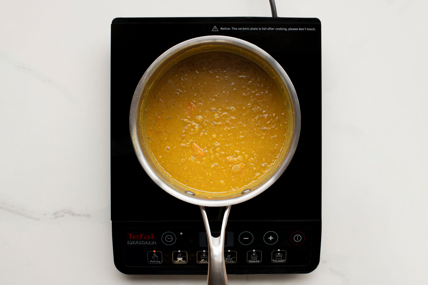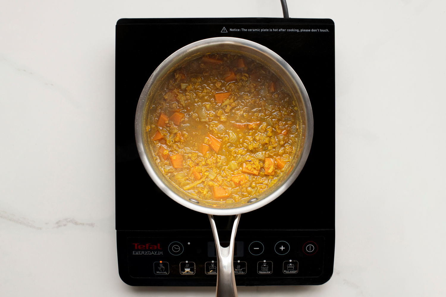 Mash the sweet potatoes into the side of the pan until you reach the consistency you feel will work best for your child. Alternatively, you can use an immersion blender to blend portions or all of the daal.
