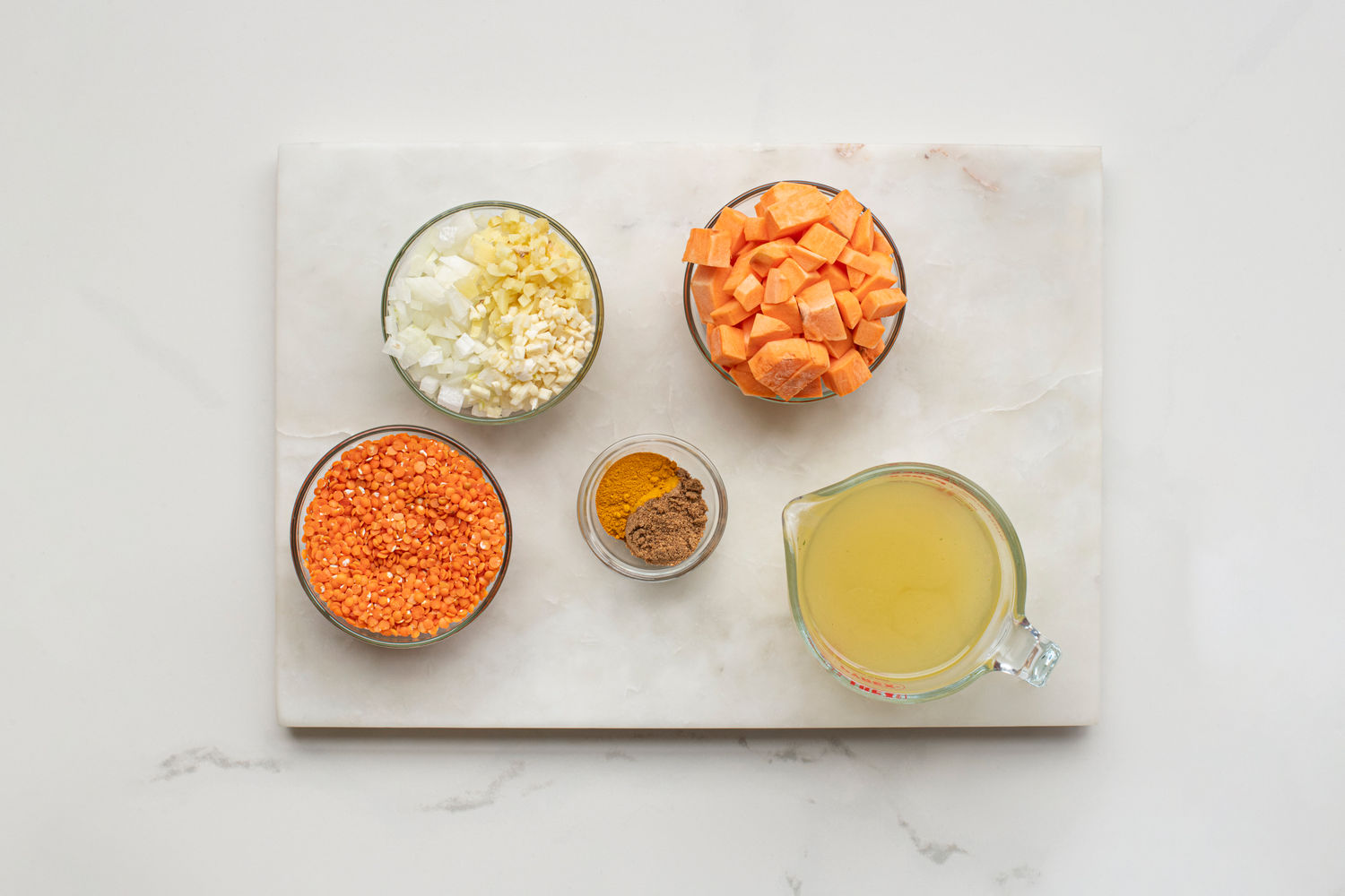 Add the lentils and sweet potatoes and stir to coat in the spices. The add the vegetable stock. Bring to a simmer and cook, stirring occasionally, for 15-16 minutes, or until the lentils and sweet potatoes are tender.