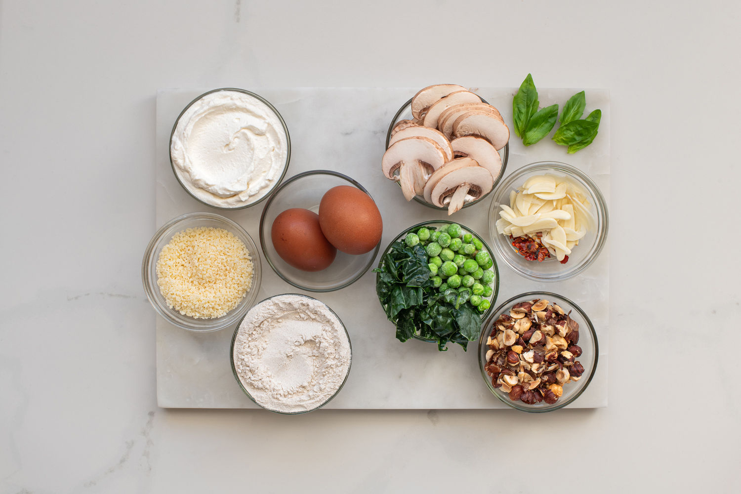 Ricotta and Buckwheat Gnudi with Mushrooms, Kale, Peas and Hazelnuts
