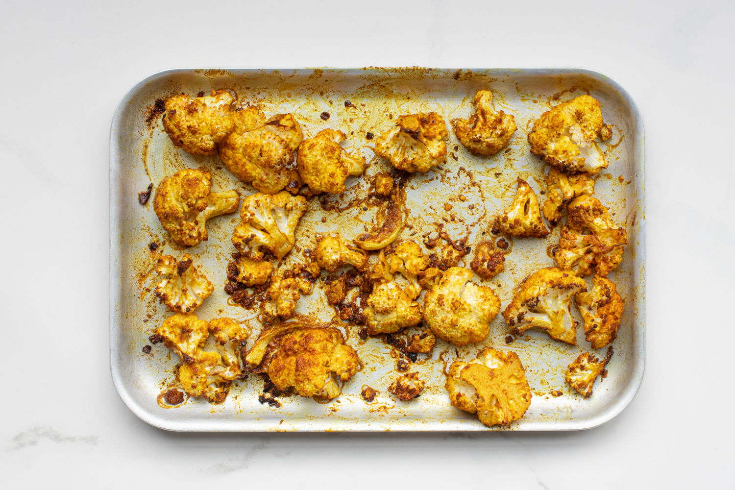 Put the cauliflower florets onto a baking tray. Drizzle with the olive oil, sprinkle over the spices and a pinch of salt and toss to coat. Roast in the oven for 15-17 mins until tender and golden brown.