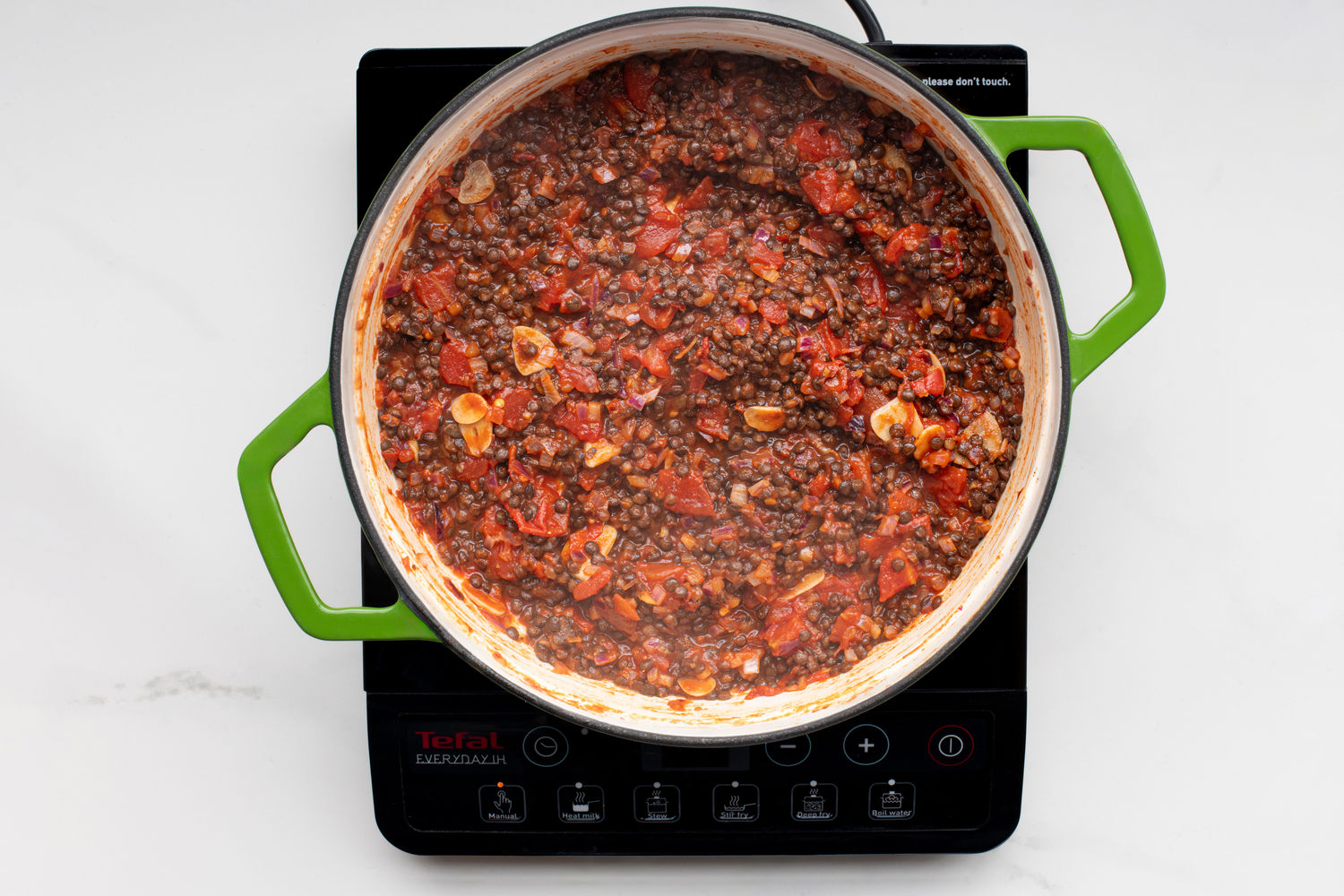 Add the tomatoes and lentils. Bring to a simmer and cook for 8-10 minutes, until darkened and reduced. Adjust seasoning to taste.