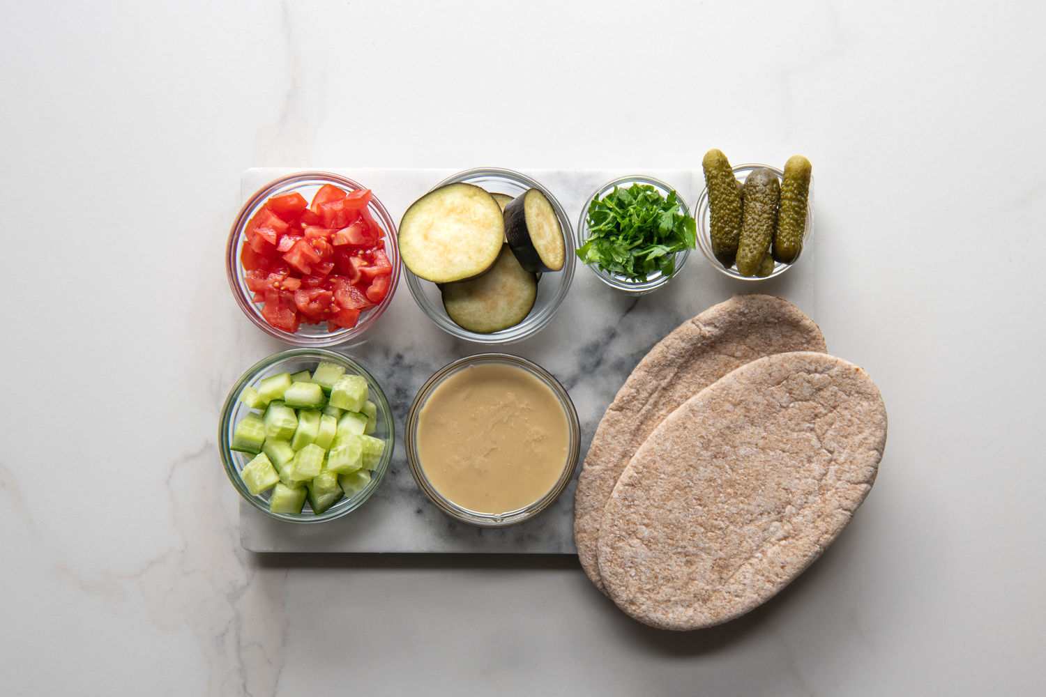 Air-Fried Aubergine, Tomato, Cucumber and Egg Pitta with Hummus and Tahini Dressing