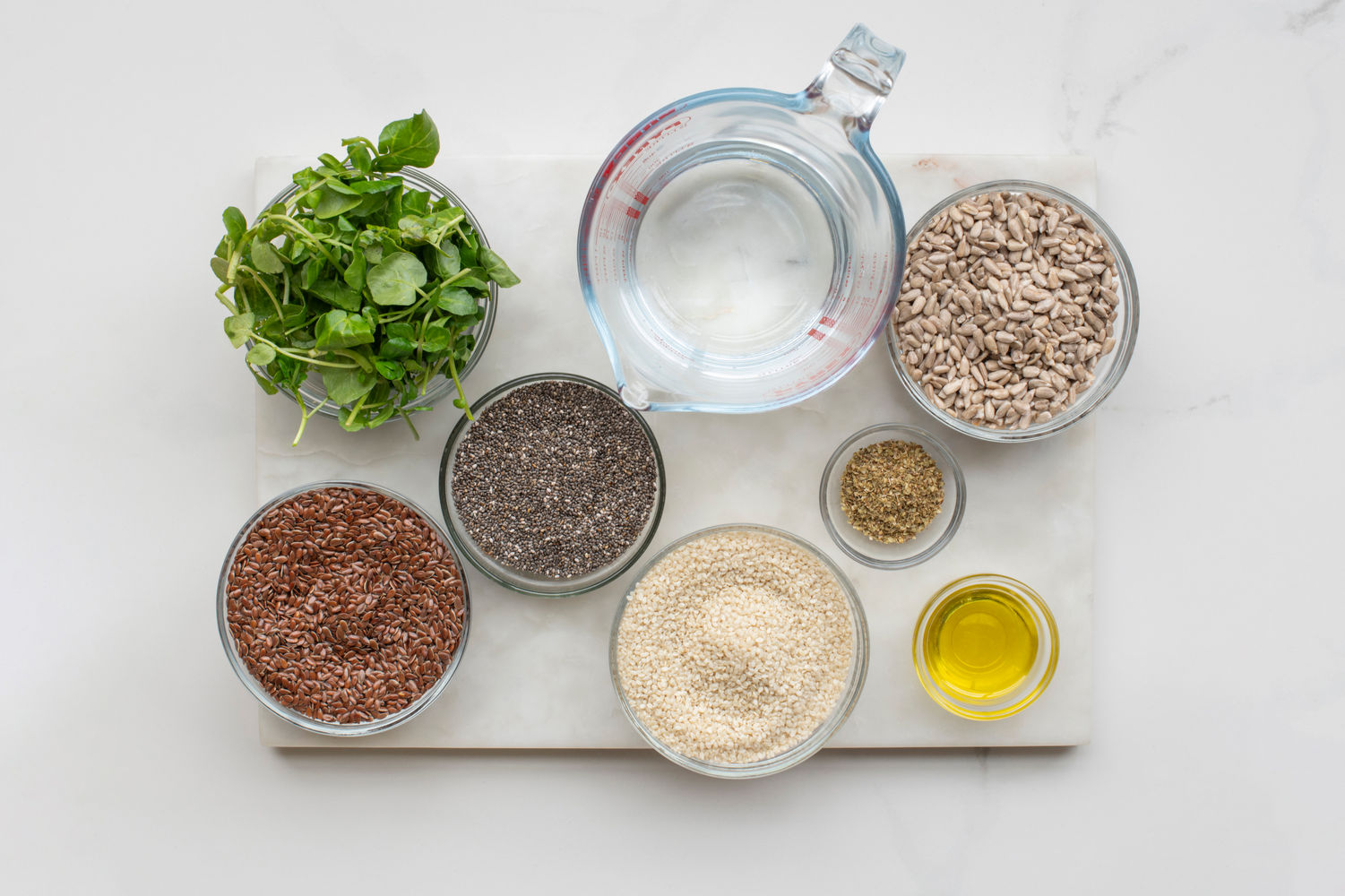 These nutrient-dense crackers combine the peppery flavour of watercress with a mix of crunchy seeds. With just a few simple steps — blend, mix, spread... and bake — these crackers are surprisingly easy to make and perfect for snacking, dipping, or serving crumbled over soups and salads. Read more These nutrient-dense crackers combine the peppery flavour of watercress with a mix of crunchy seeds. With just a few simple steps — blend, mix, spread and bake — these crackers are surprisingly easy to make and perfect for snacking, dipping, or serving crumbled over soups and salads.