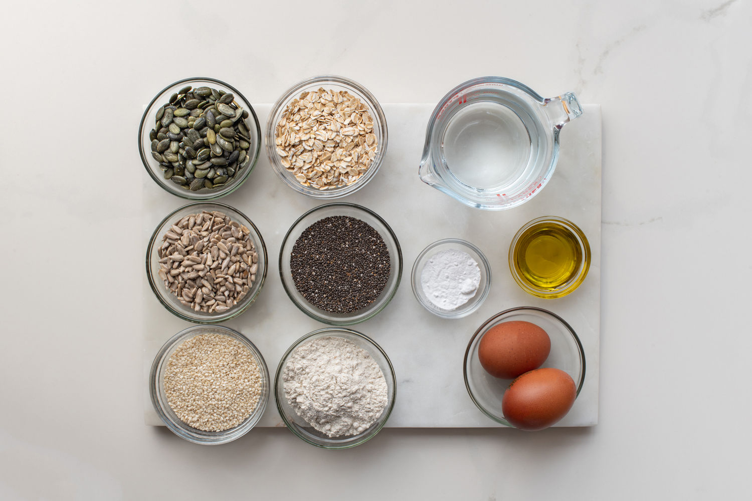 Place the pumpkin, sunflower and sesame seeds, oats, chia seeds, milled flax, buckwheat flour and salt into a bowl. Add the water and olive oil and stir to combine. Cover and set aside to soak overnight, or for at least 1 hour.