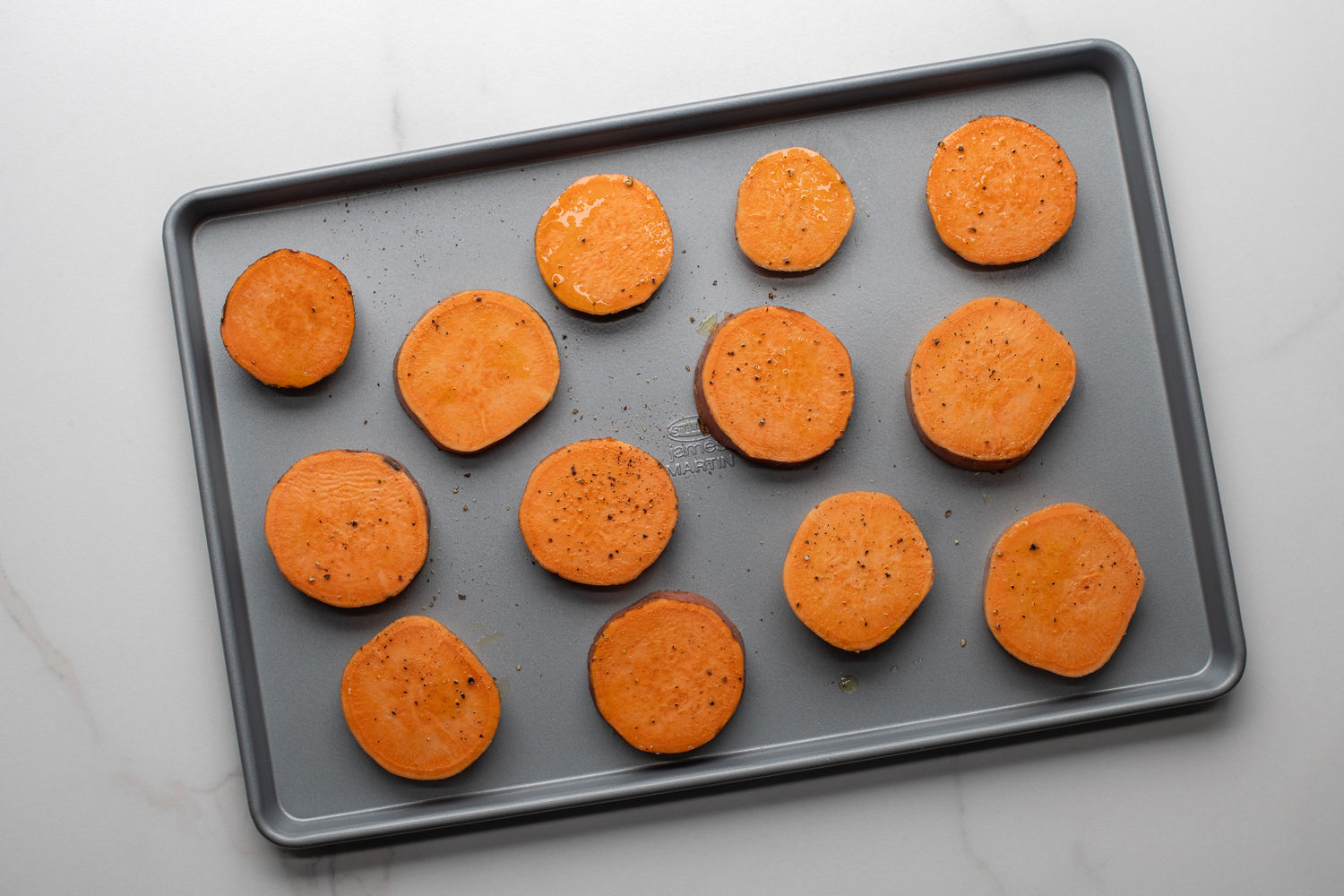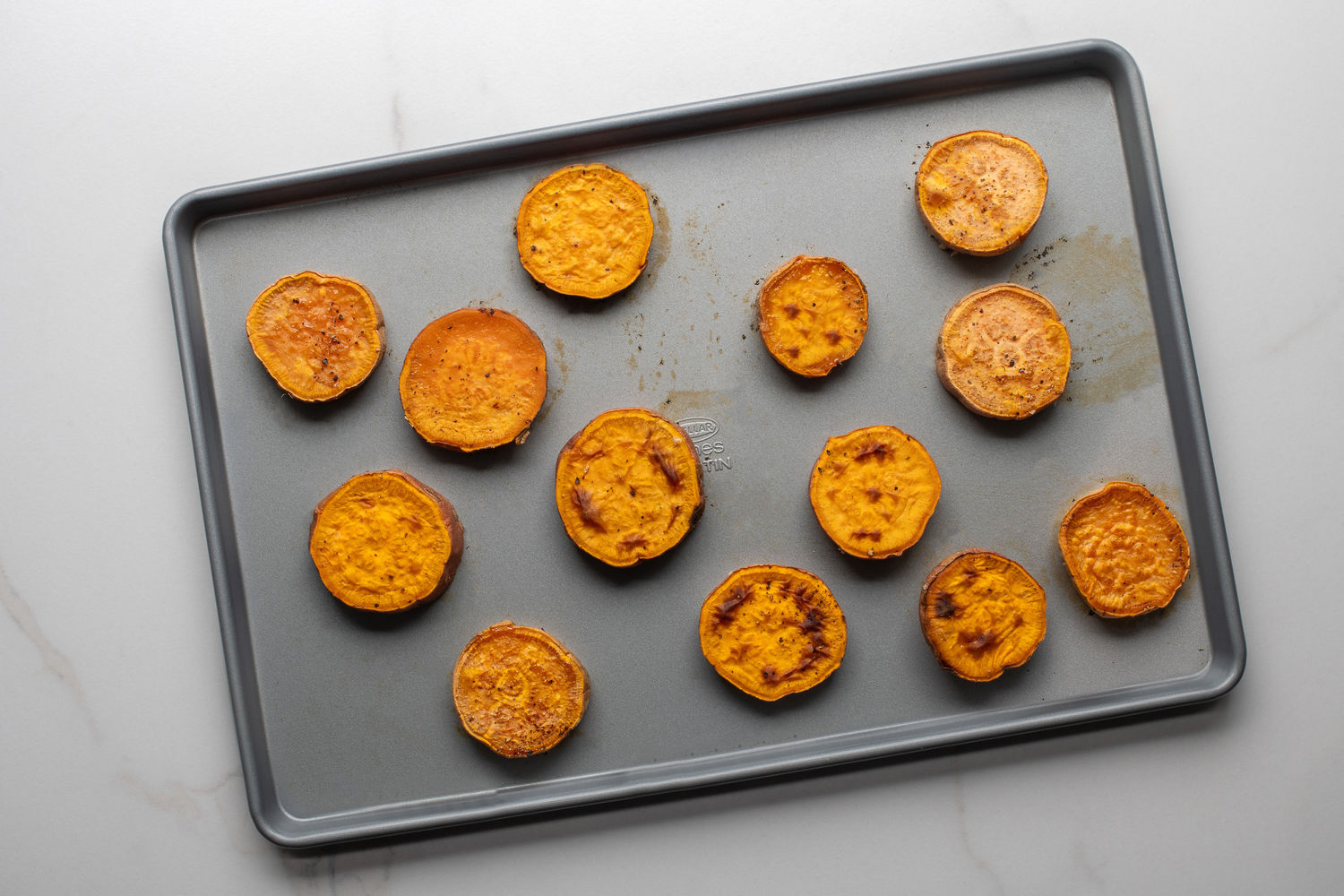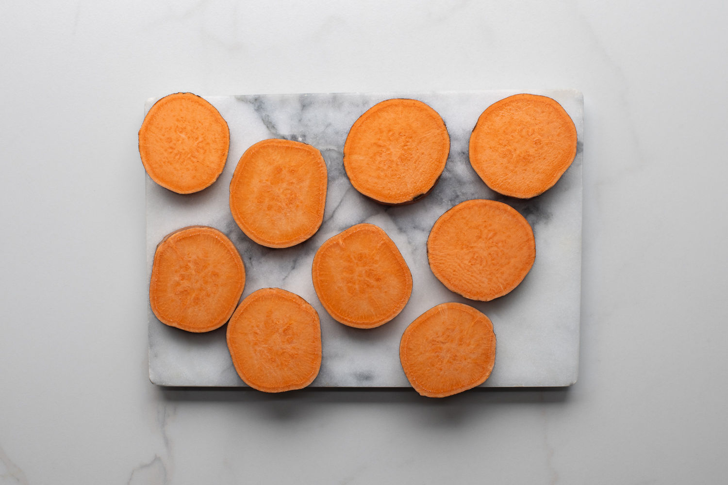Carefully slice the sweet potatoes into rounds, 3cm thick.