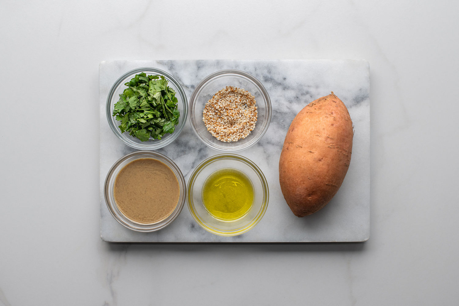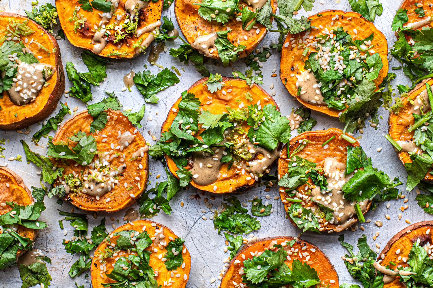 Remove from the oven. Lightly drizzle with tahini, and sprinkle with coriander, lime juice, lime zest and sesame seeds before serving.