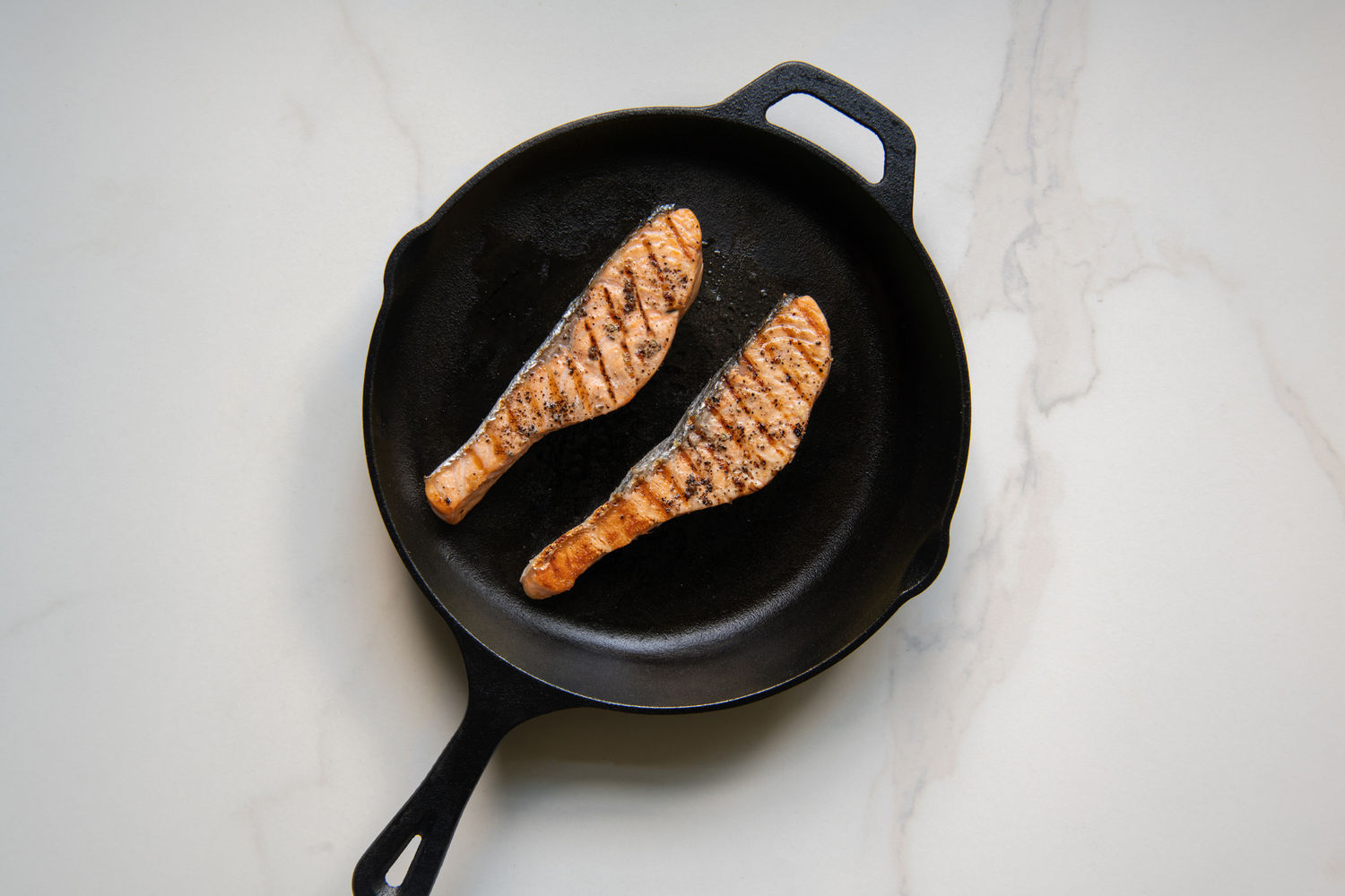 Brush the salmon fillets with a little oil and season well. Place under the grill to cook for 8-10 minutes, until opaque and nicely coloured.