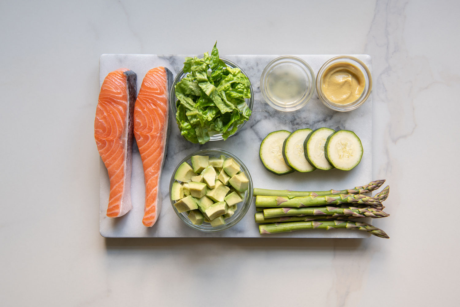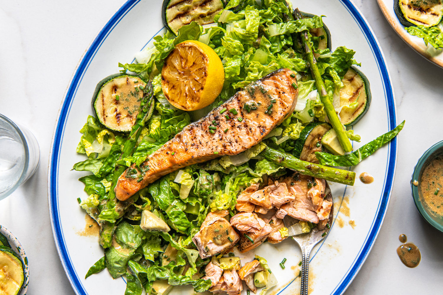 Serve the salmon, grilled vegetables and avocado on a bed of the romaine lettuce, finishing with the dressing and an extra squeeze of the grilled lemon.